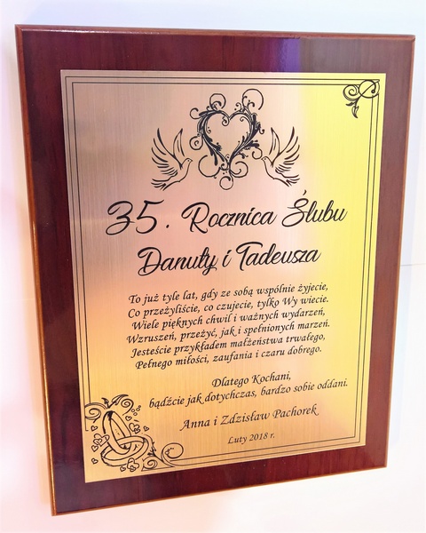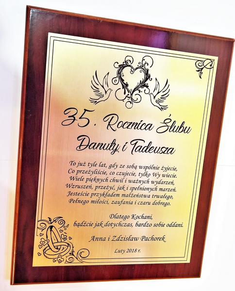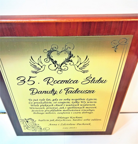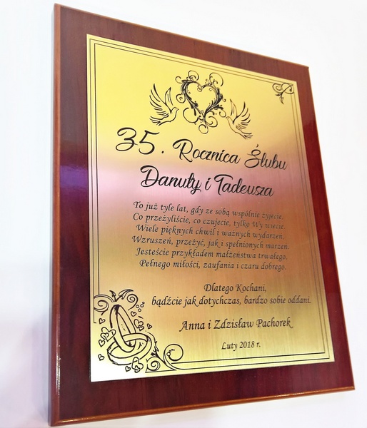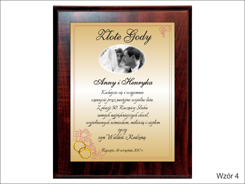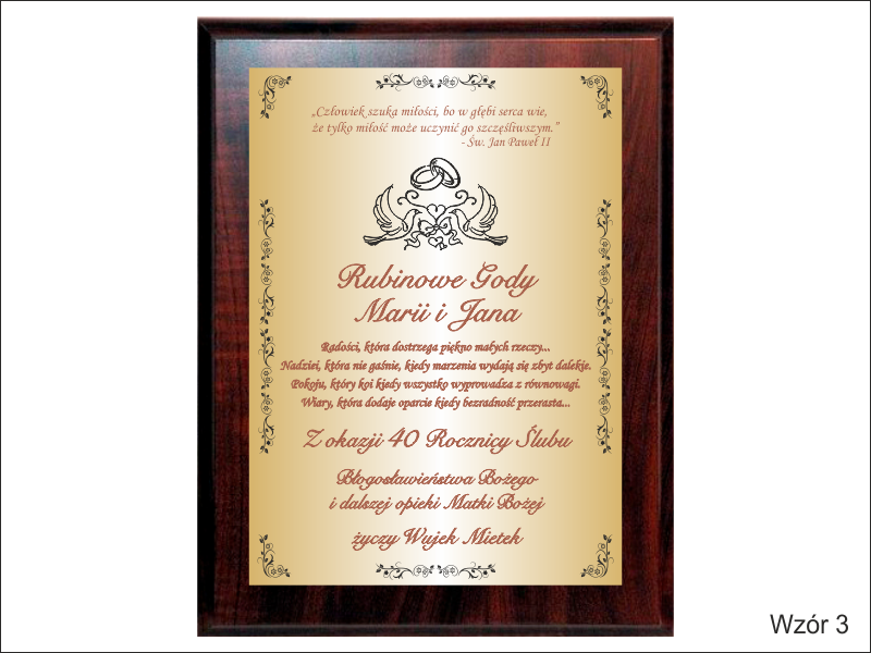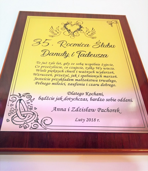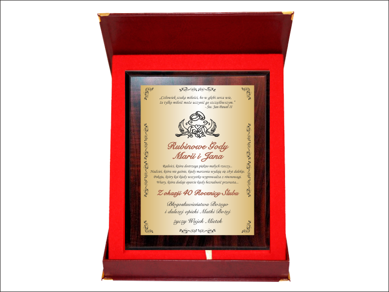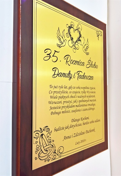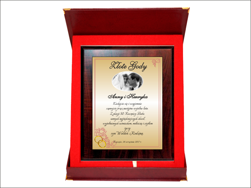 Dedykacja, grafiki, zdjęcia oraz ozdobniki nadrukowane są.na złotej blaszce lub grawerowane w laminacie.