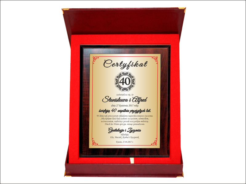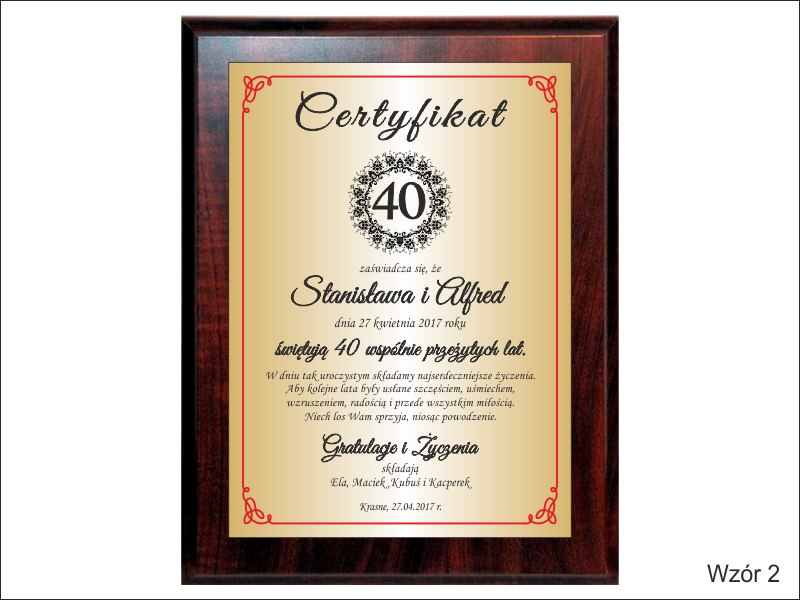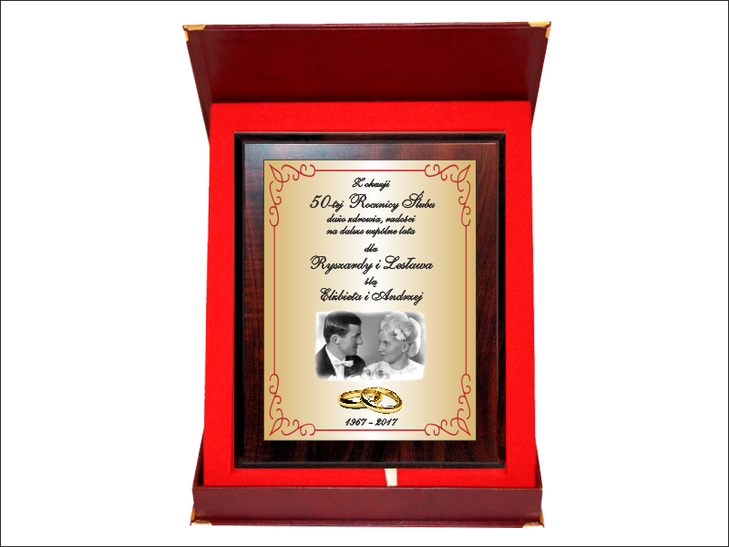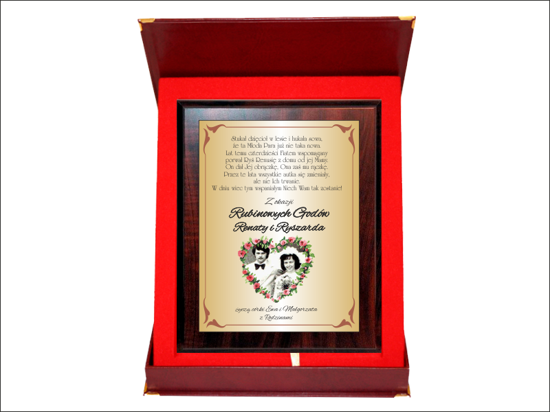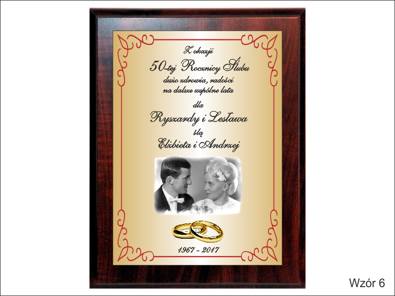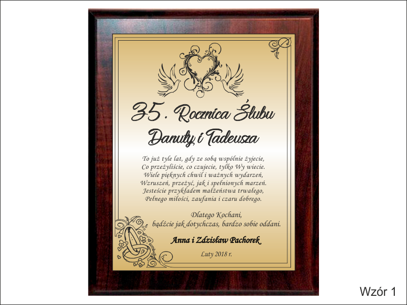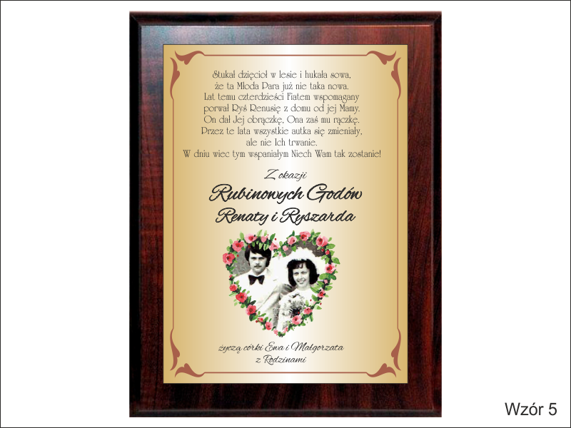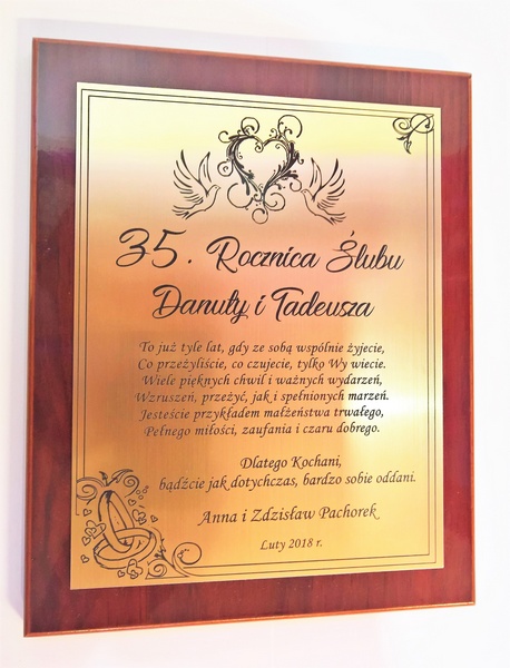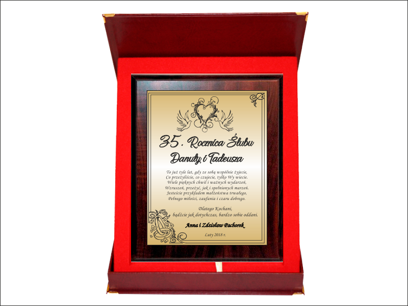 Dedykacja, grafiki, zdjęcia oraz ozdobniki nadrukowane są.na złotej blaszce lub grawerowane w laminacie.