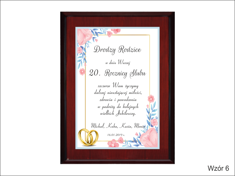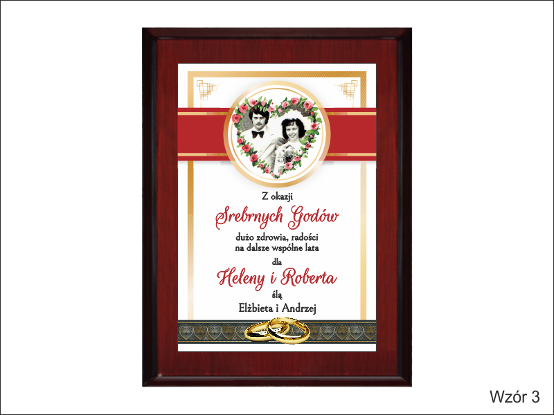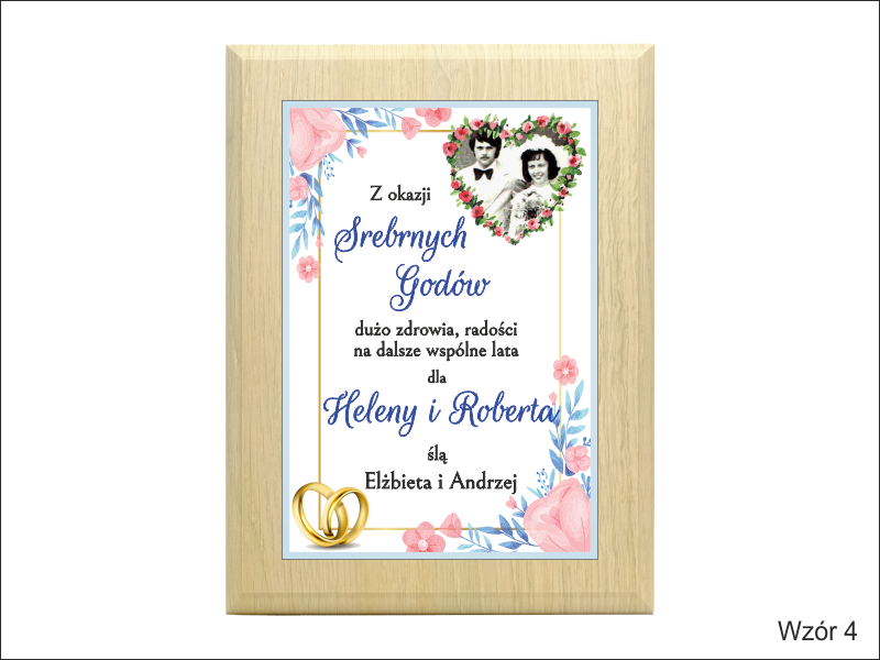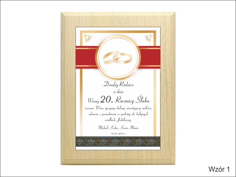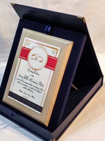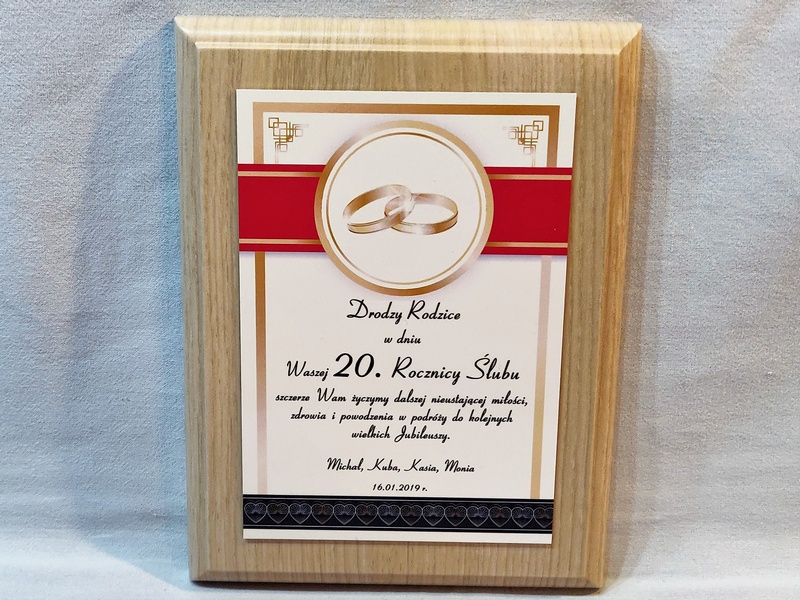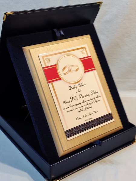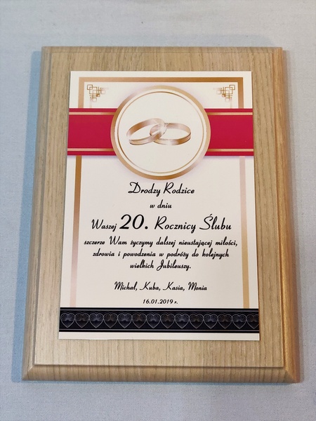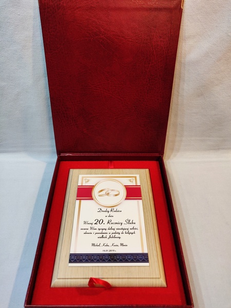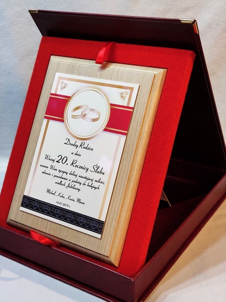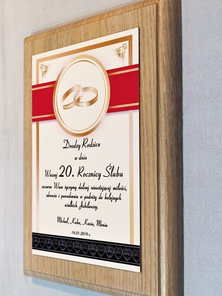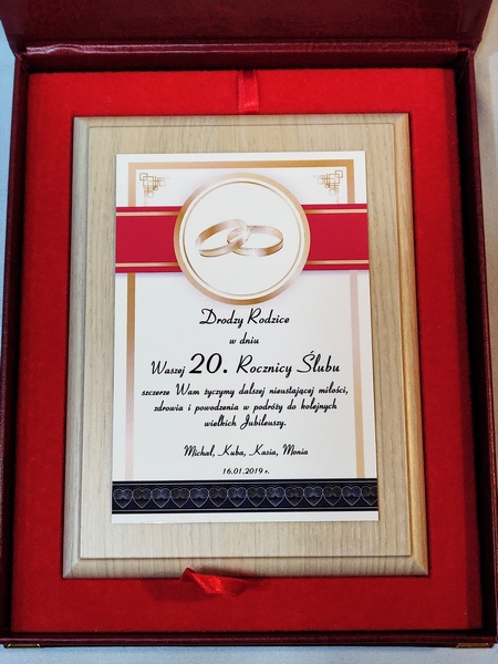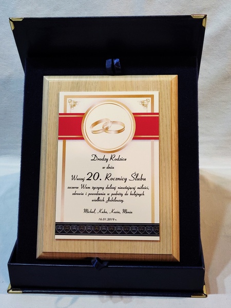 Pamiątka z okazji Rocznicy Ślubu w formie dyplomu okolicznościowego na drewnianym lakierowanym podkładzie.