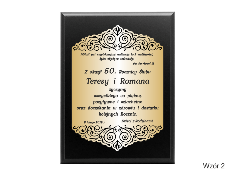 Dedykacja, grafiki oraz ozdobniki wykonane są w złotym laminacie.
