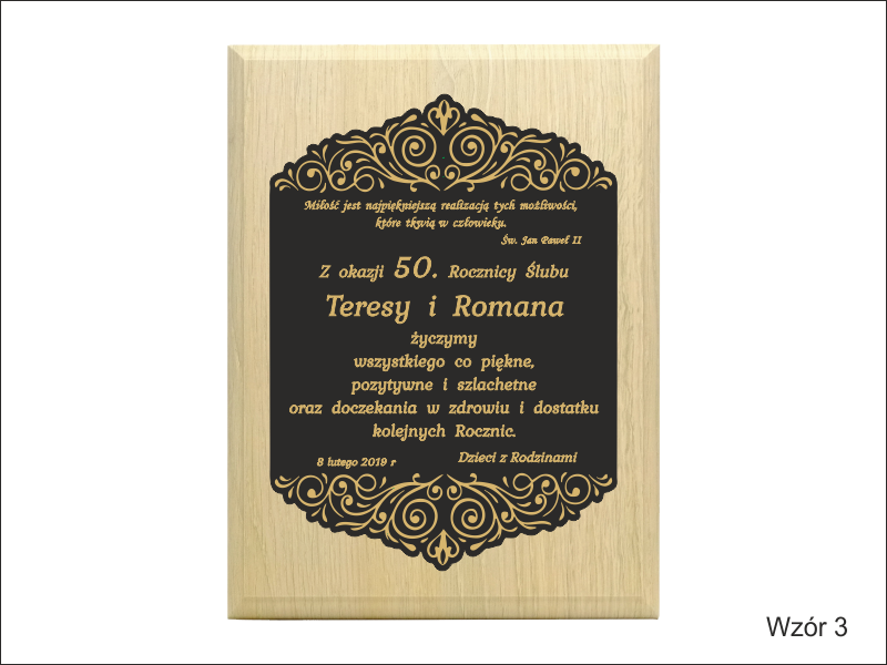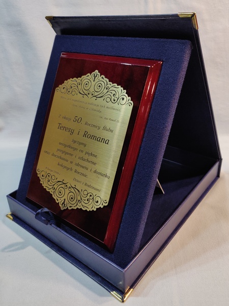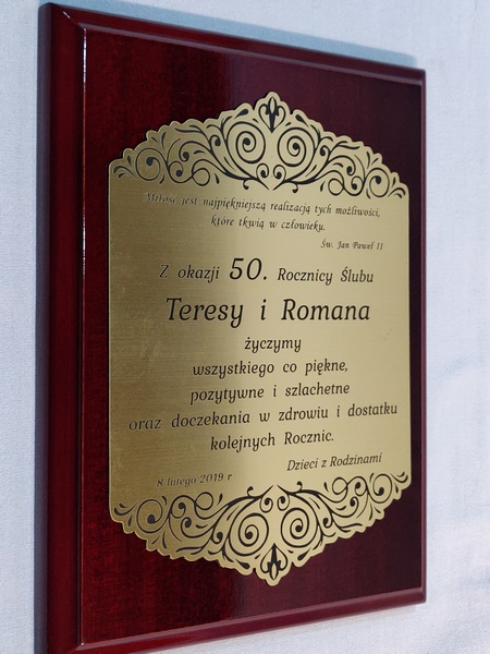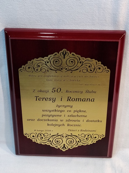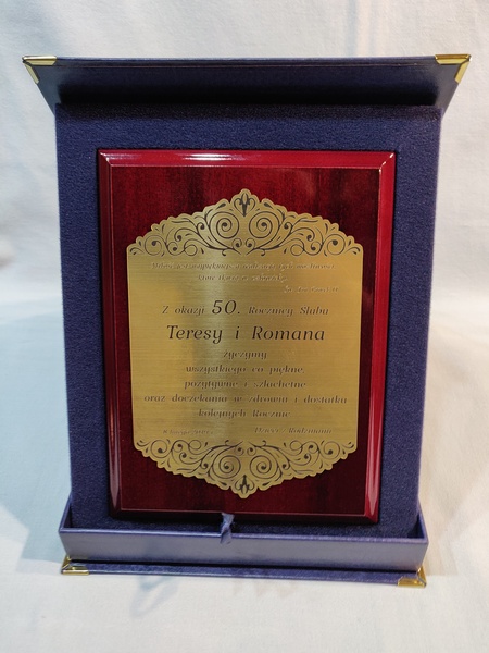 Pamiątka z okazji Rocznicy Ślubu w postaci dyplomu okolicznościowego na drewnianym lakierowanym podkładzie.