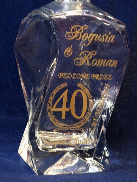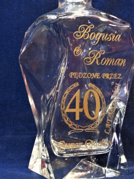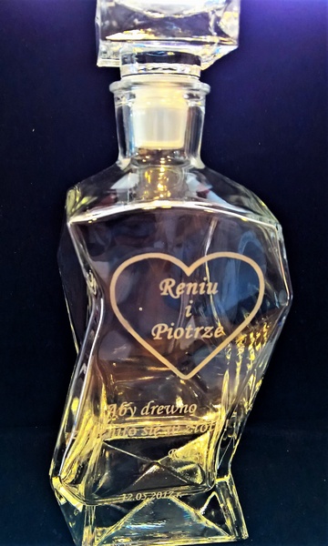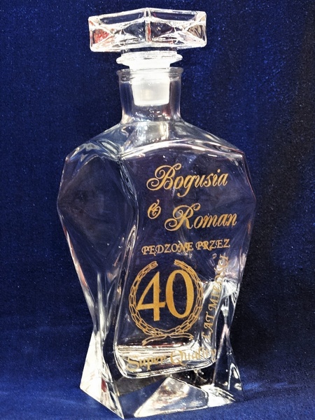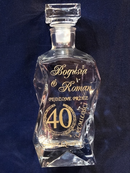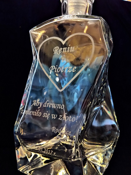 Prezent w postaci karafki łamanej z grawerem okolicznościowej dedykacji i ozdobnych grafik z okazji Rocznicy Ślubu.