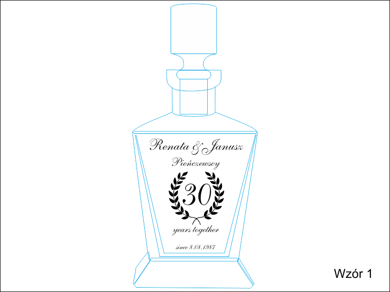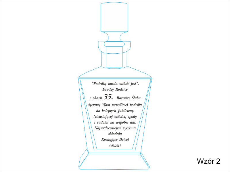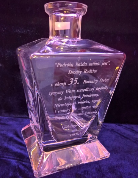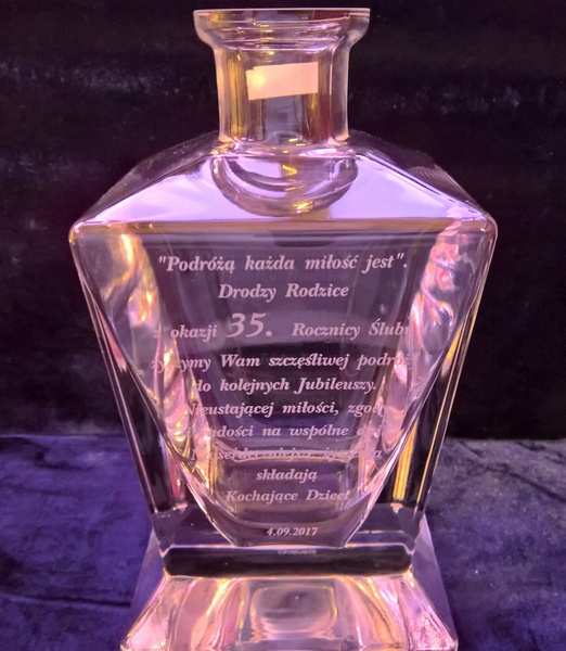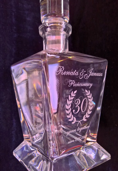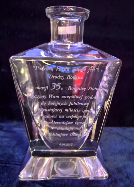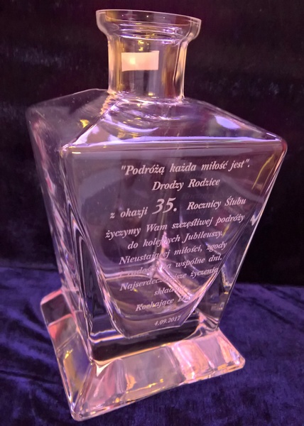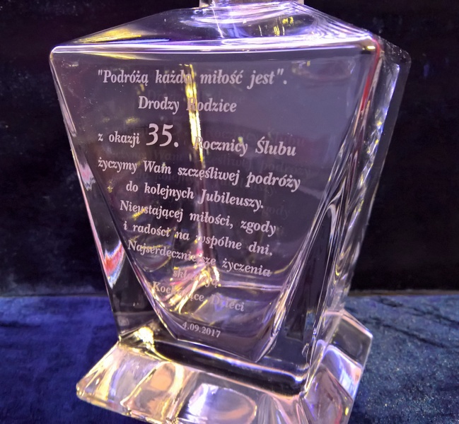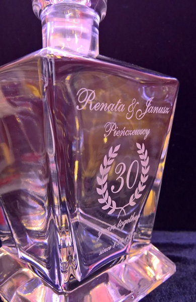 Prezent z okazji Rocznicy Ślubu w postaci karafki Krosno Caro "Kapliczka" z grawerem dedykacji i ozdobnych grafik.