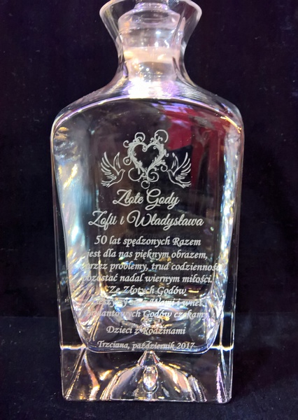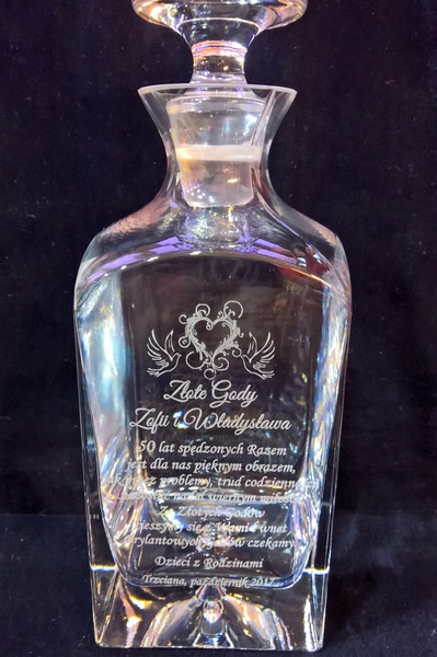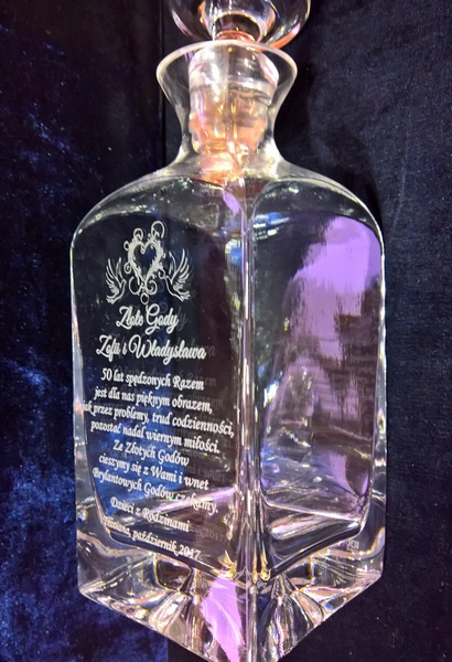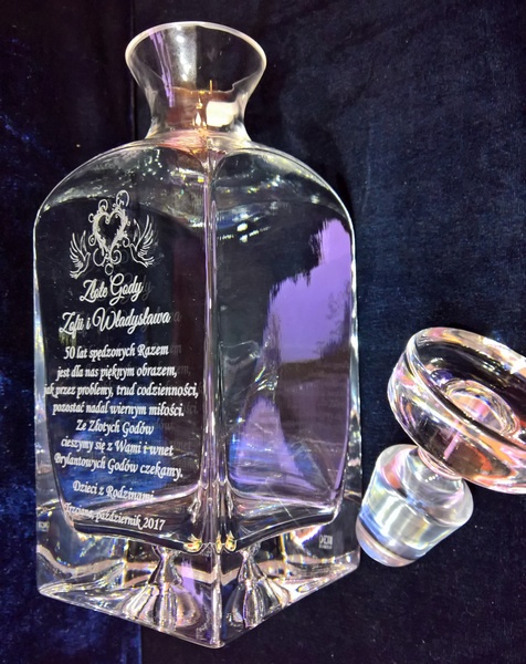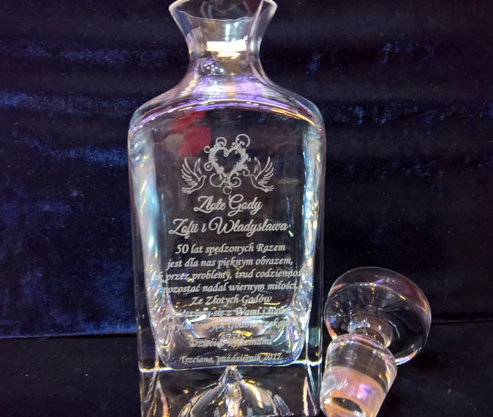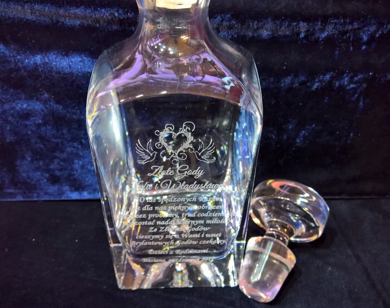 Karafka Krosno Caro z korkiem "Grzybek" z grawerem dedykacji i ozdobnych grafik jako prezent na pamiątkę Rocznicy Ślubu.