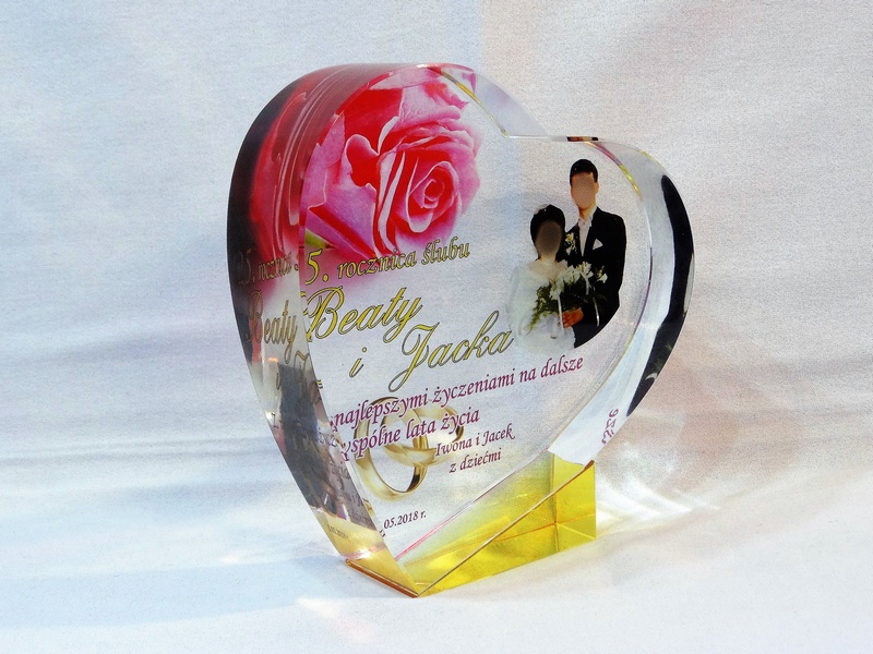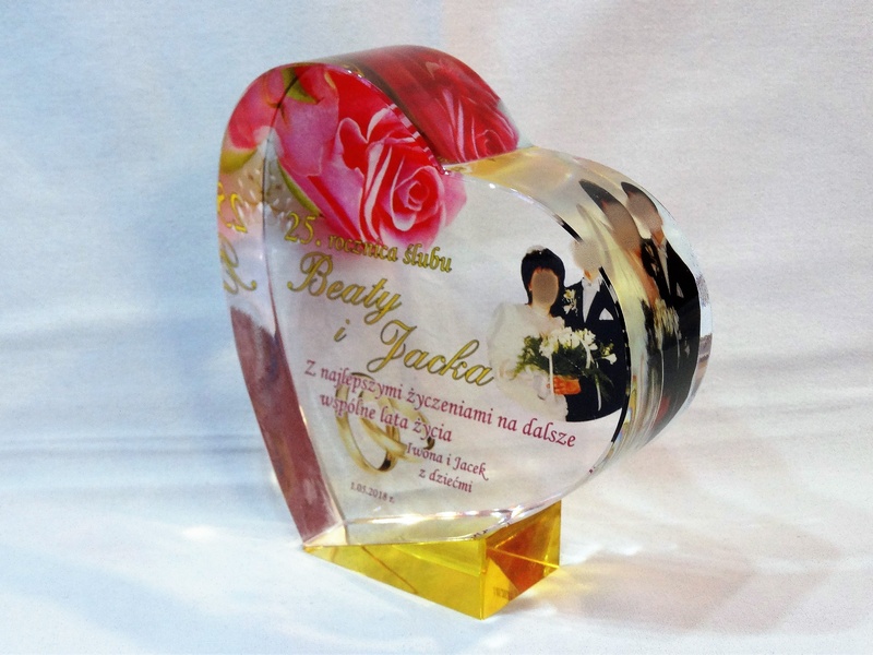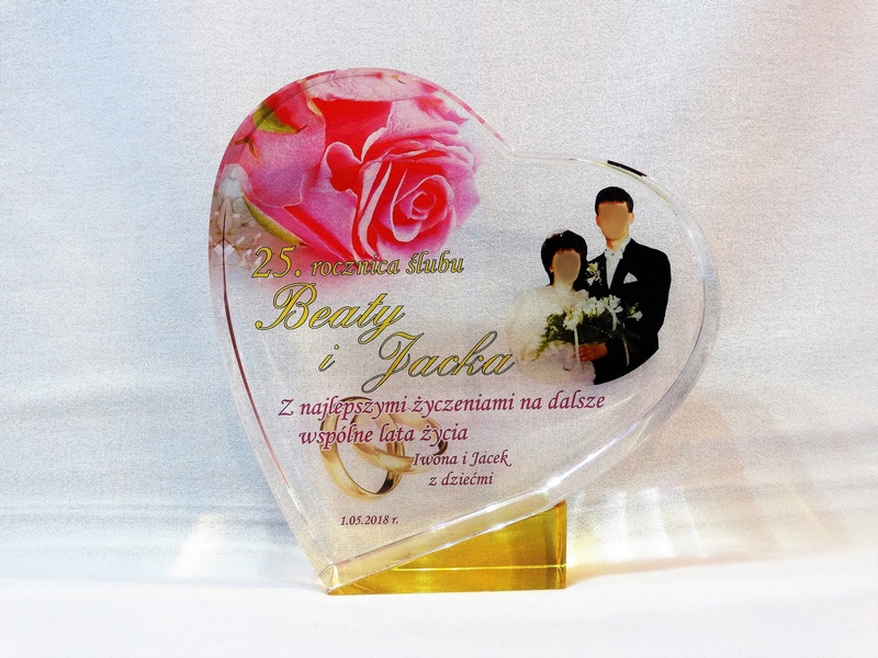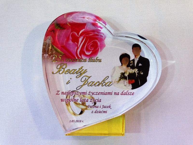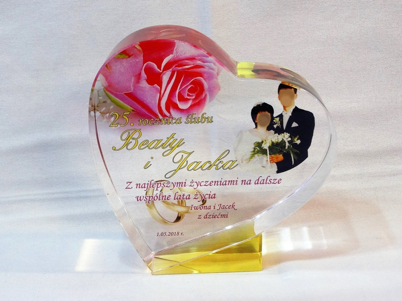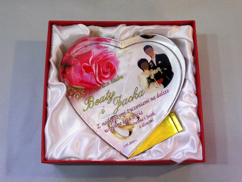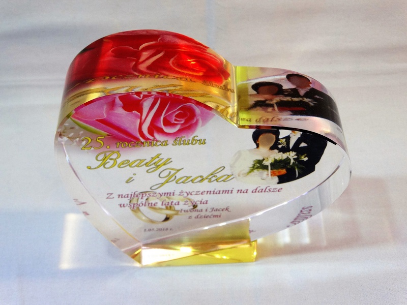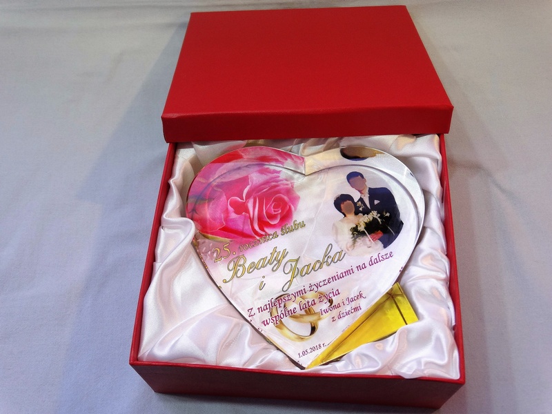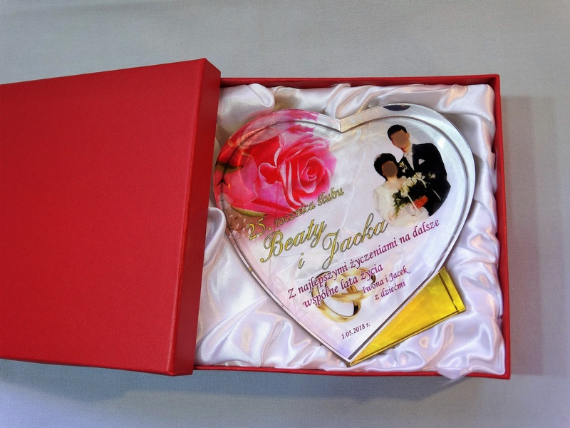Pamiątkowa statuetka szklana C055 "serce" z grubego szlifowanego szkła w kształcie serca z nadrukiem dedykacji z okazji Rocznicy Ślubu.