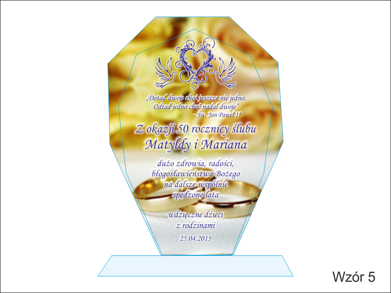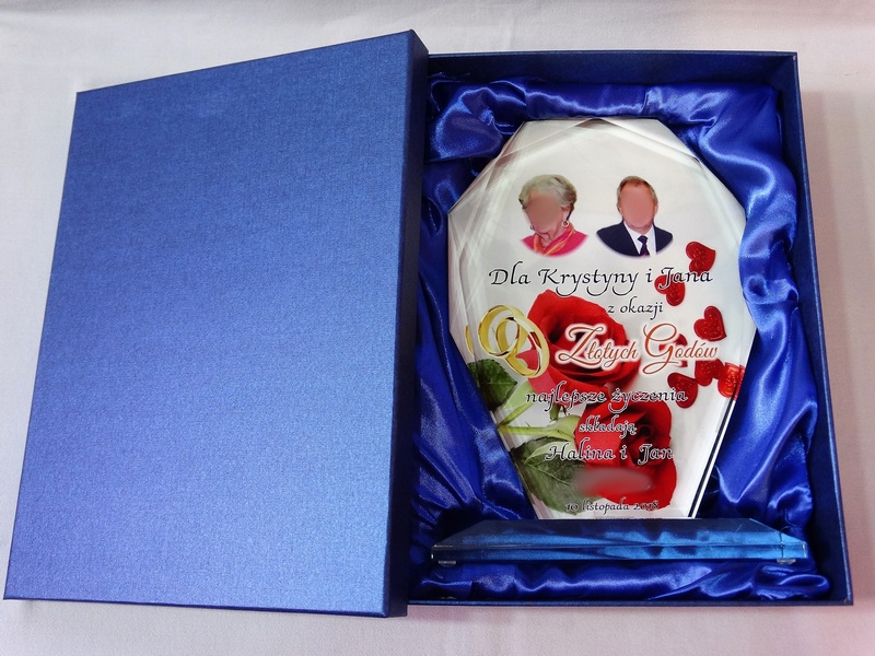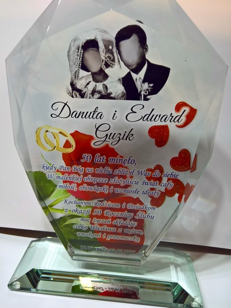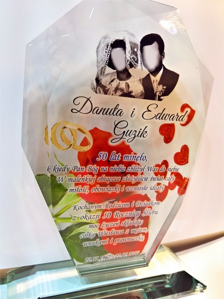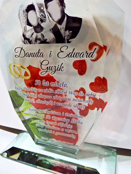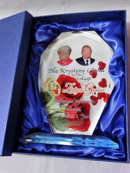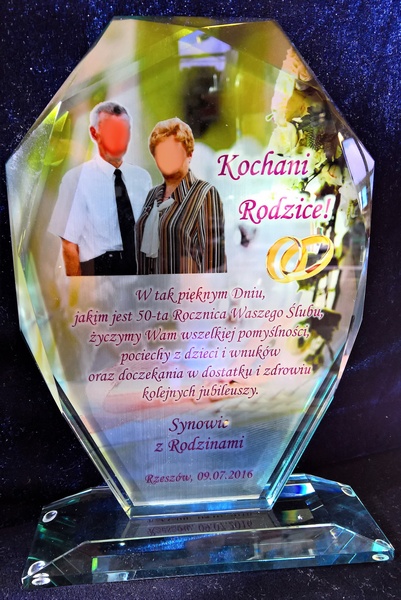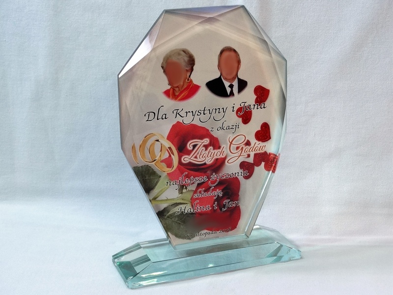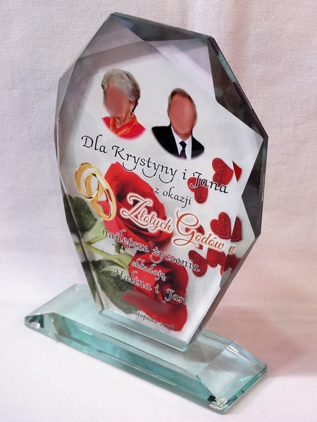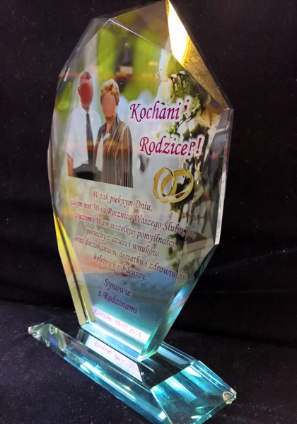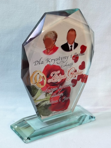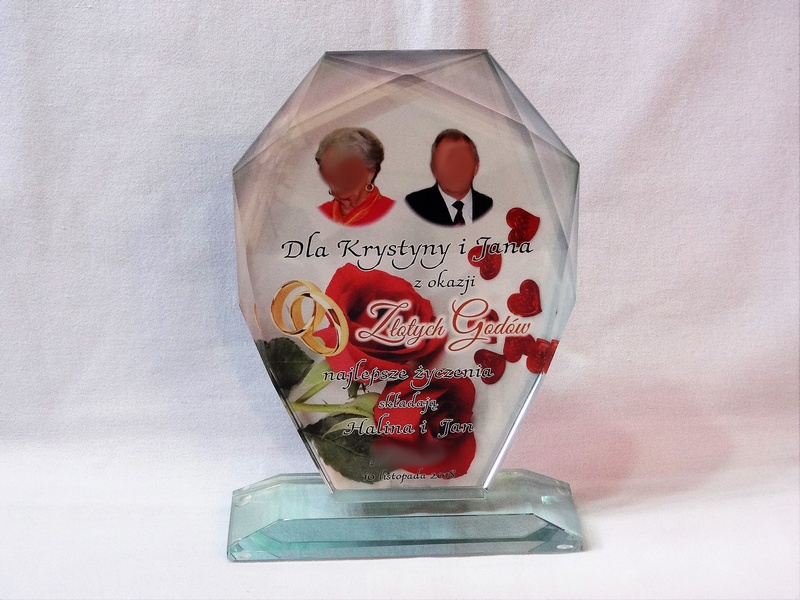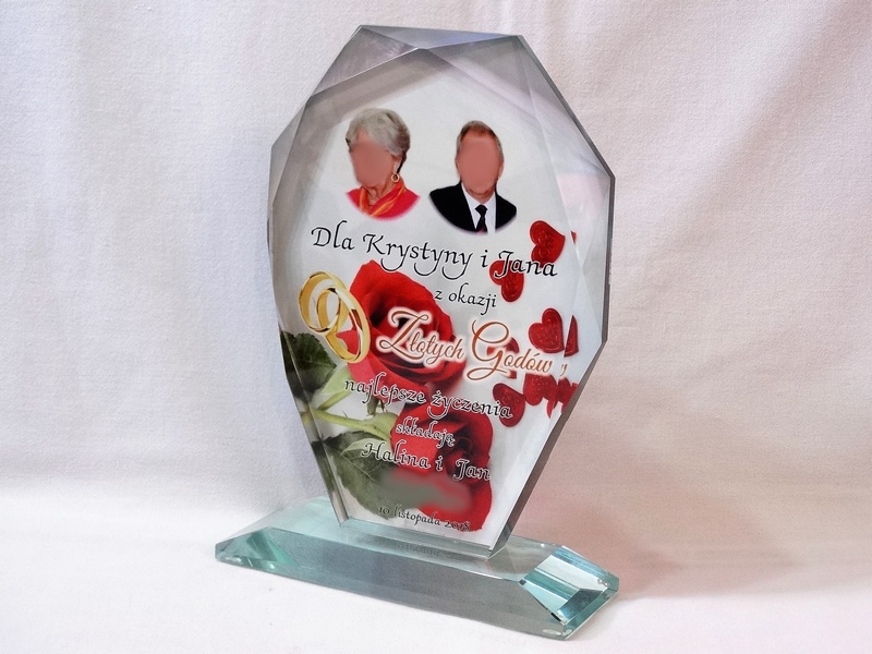 Pamiątkowa statuetka szklana G007 z grubego szlifowanego szkła z nadrukiem dedykacji z okazji Rocznicy Ślubu.