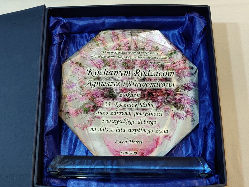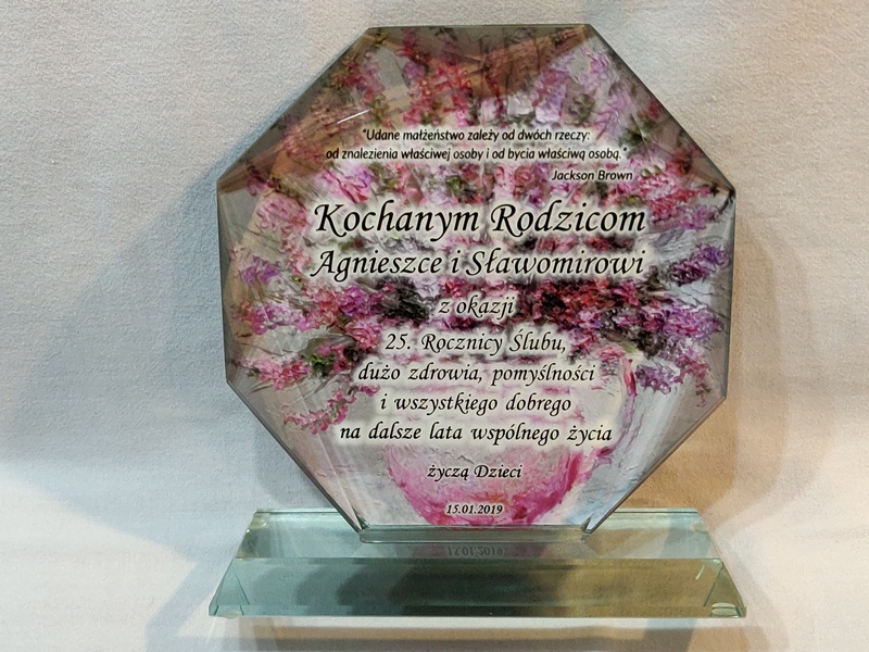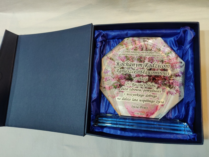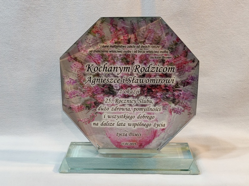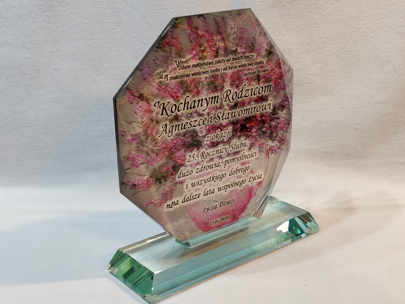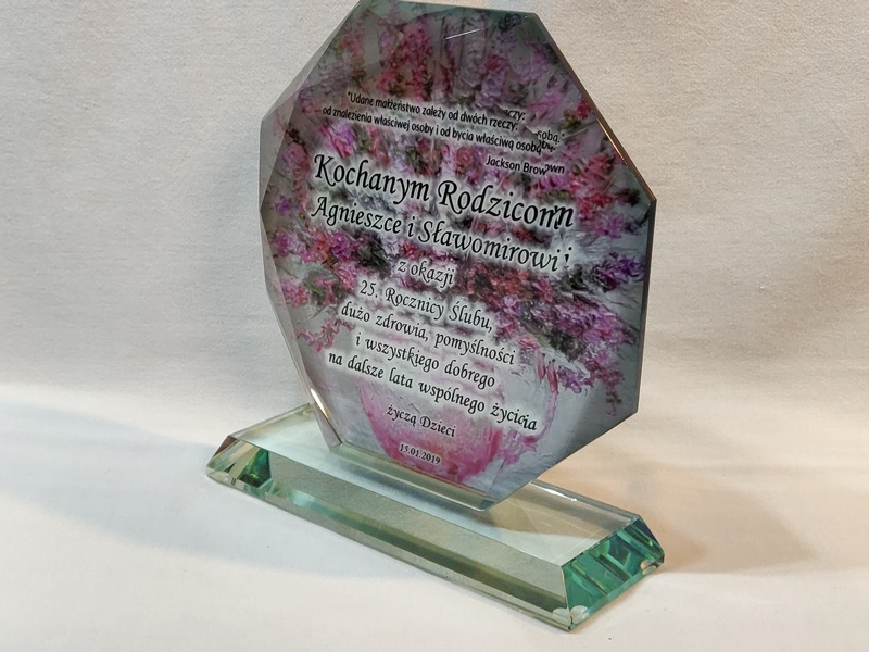 Pamiątkowa statuetka szklana G020 z grubego szlifowanego szkła z nadrukiem dedykacji i ozdobnych grafik z okazji Rocznicy Ślubu.