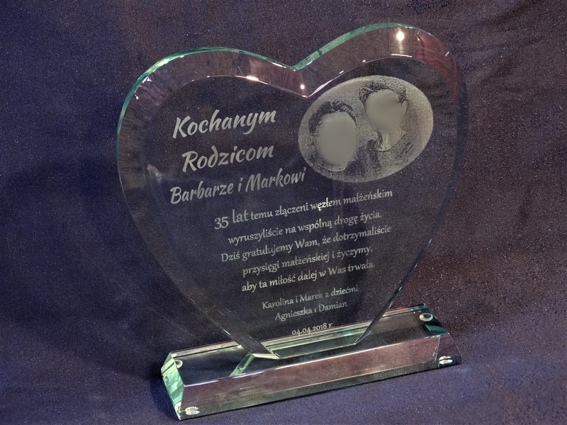 Pamiątkę z grawerem z okazji rocznicy ślubu można także wykonać na innych modelach statuetek szklanych.