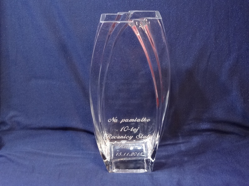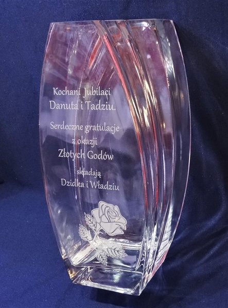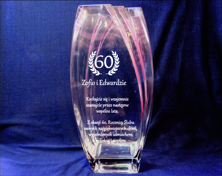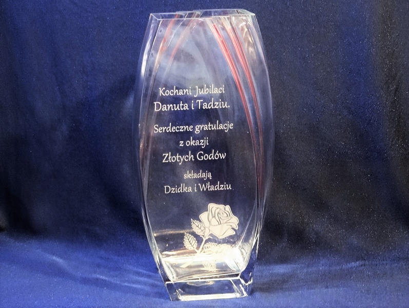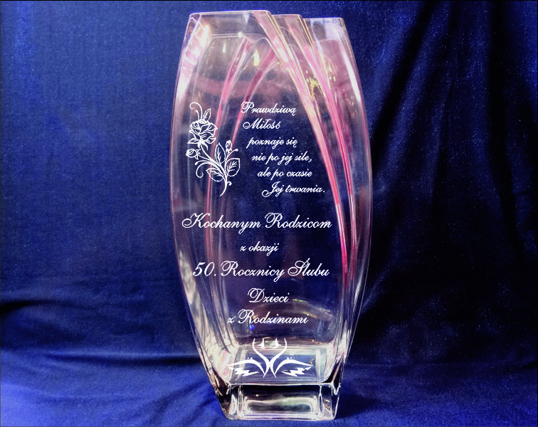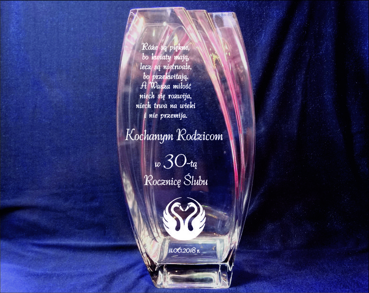 Na wazonie wykonany jest grawer ozdobników i dedykacji na pamiątkę Rocznicy Ślubu.