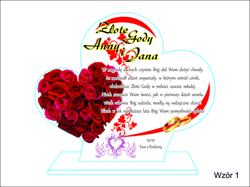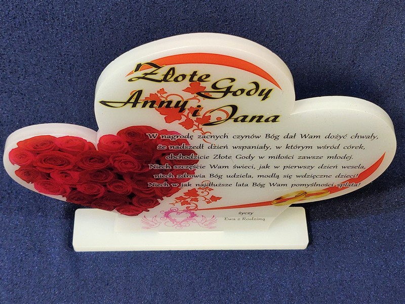 Na pleksie wykonany jest bezpośredni nadruk dedykacji, ozdobnych grafik czy zdjęcia Jubilatów.