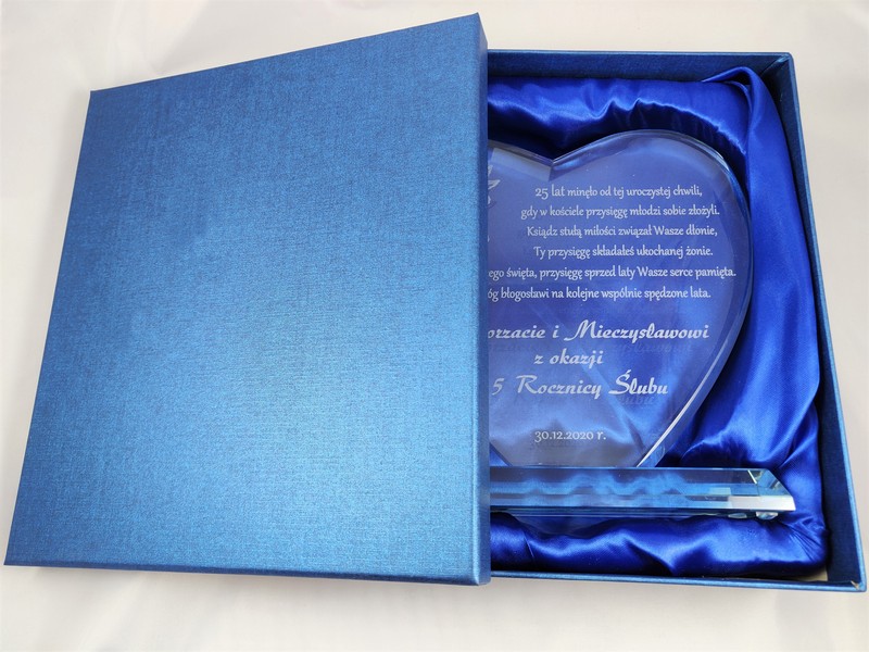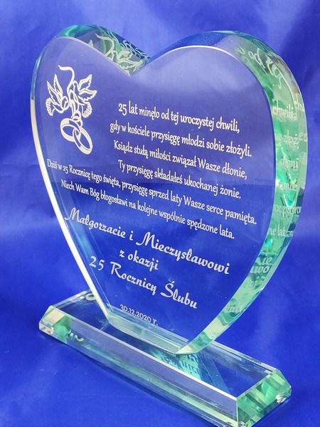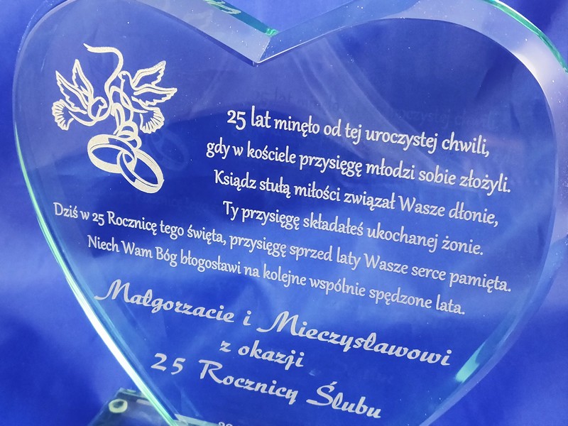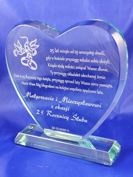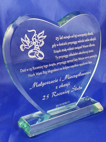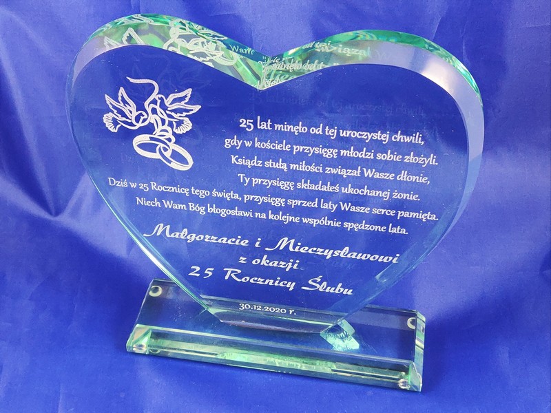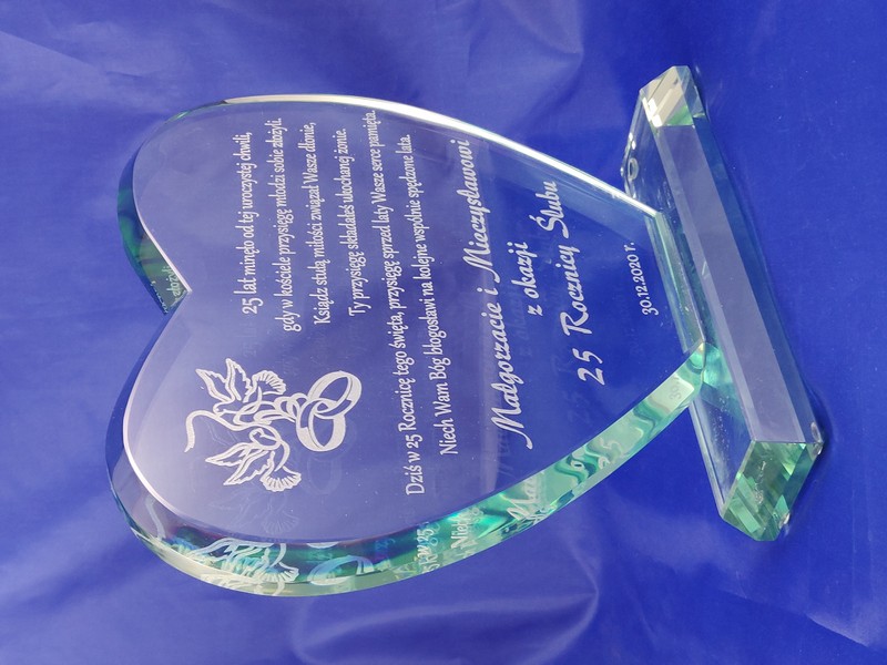 Pamiątkę z grawerem z okazji rocznicy ślubu można także wykonać na innych modelach statuetek szklanych.