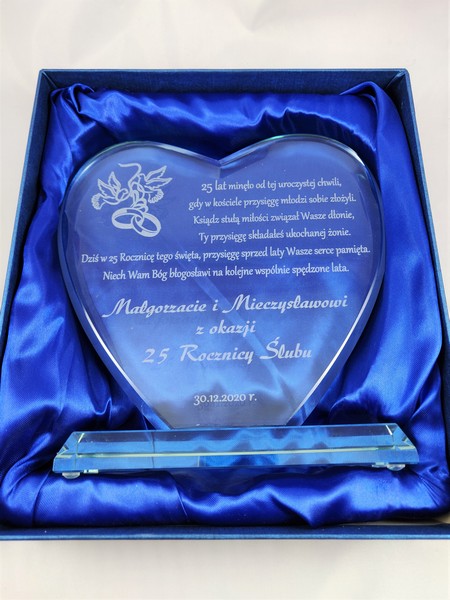Statuetka szklana G031 w kształcie serca z grubego szlifowanego szkła z grawerem dedykacji na pamiątkę Rocznicy Ślubu.