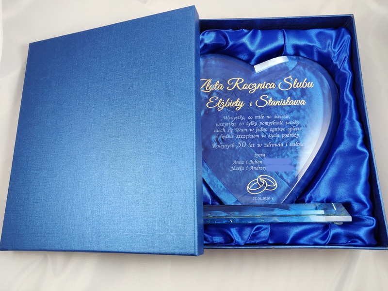 Na szkle wykonany jest grawer ozdobnych grafik oraz okolicznościowej dedykacji na pamiątkę uroczystości Jubileuszu Ślubu.