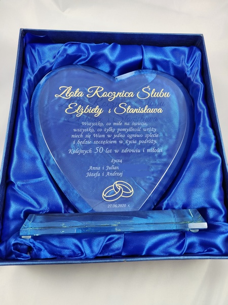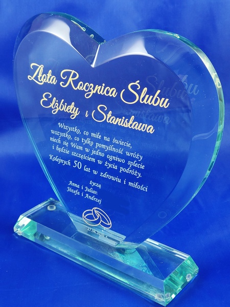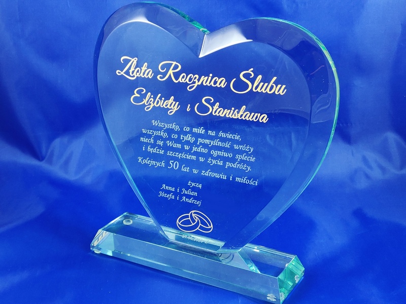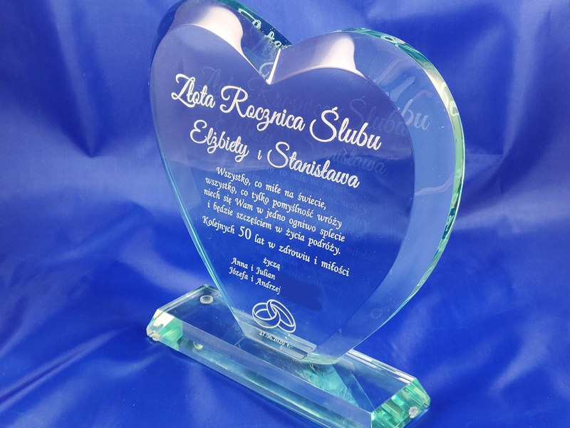 Pamiątka na Rocznicę Ślubu w postaci szklanej statuetki w kształcie serca z grawerem okolicznościowej dedykacji.