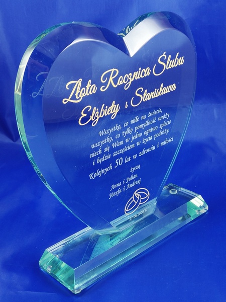 Pamiątkę z grawerem z okazji rocznicy ślubu można także wykonać na innych modelach statuetek szklanych.