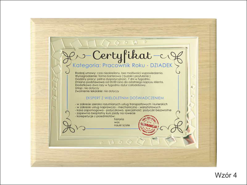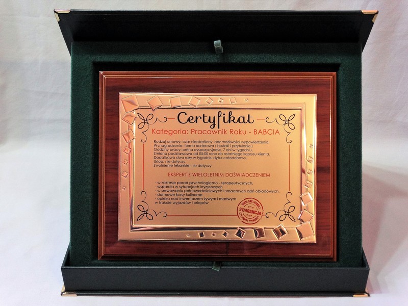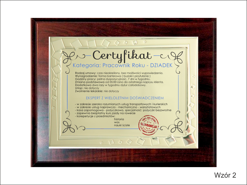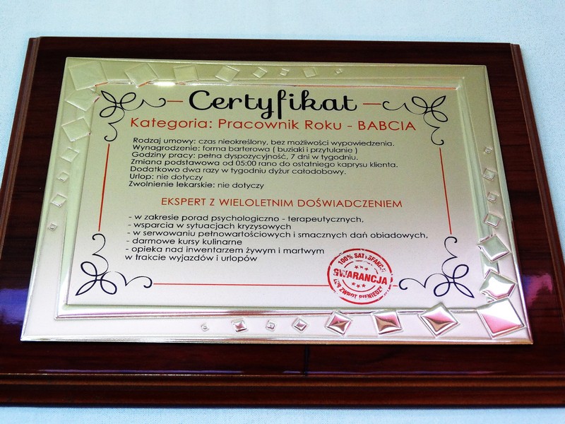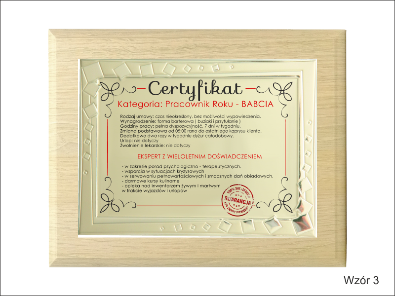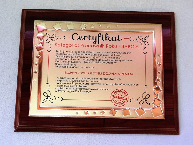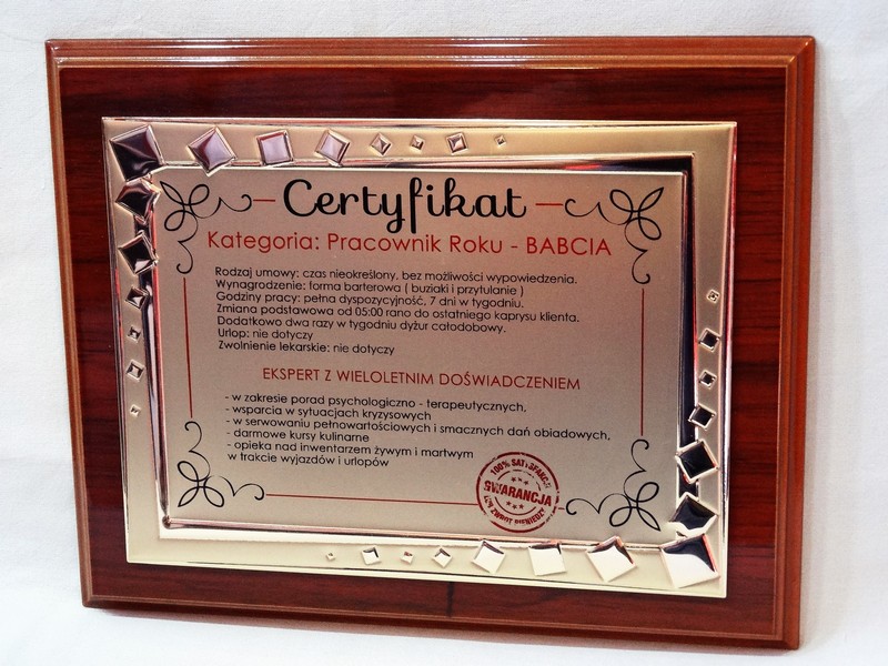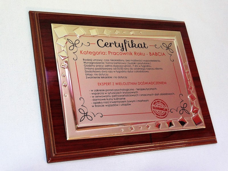 Certyfikat Babci i Certyfikat Dziadka w postaci dyplomu okolicznościowego na drewnianym podkładzie z paterą z nadrukiem.