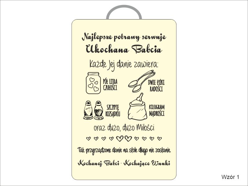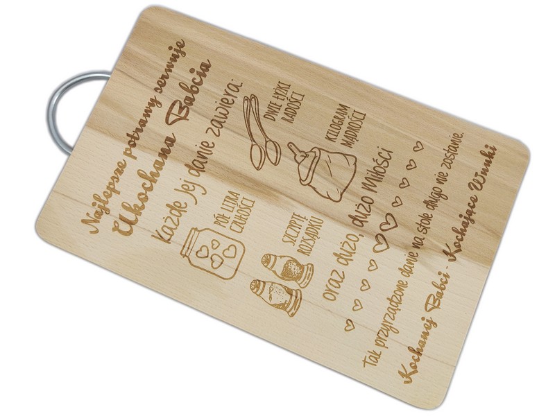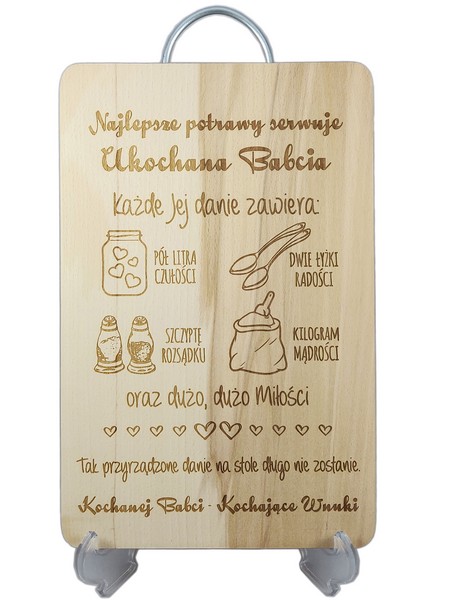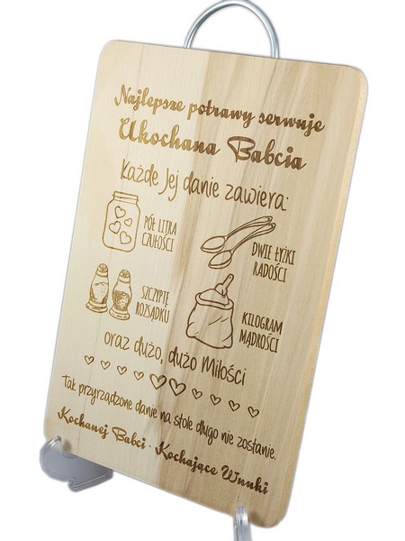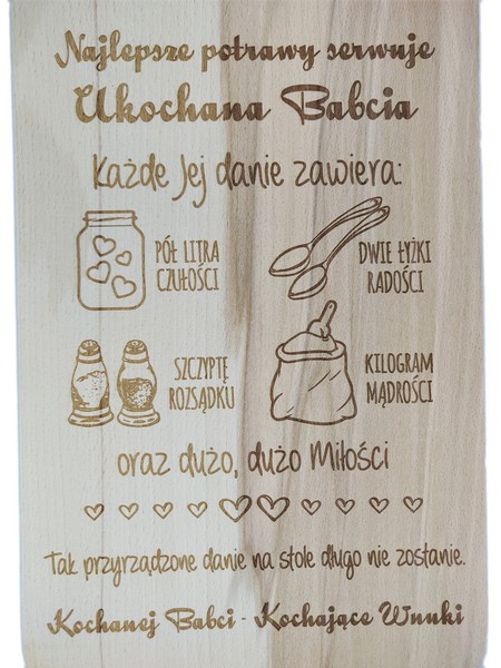 Na desce wykonany jest indywidualny grawer ozdobnych grafik i dedykacji z życzeniami dla ukochanej Babci od Wnuków.