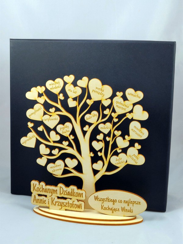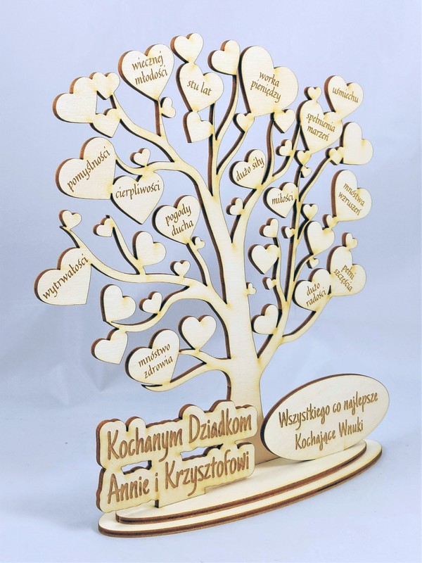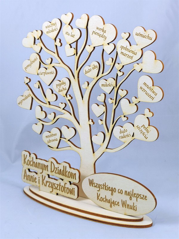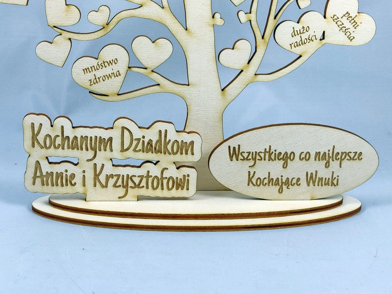 Ciekawy upominek dla dziadków w postaci drewnianego drzewka szczęścia z grawerem dedykacji.