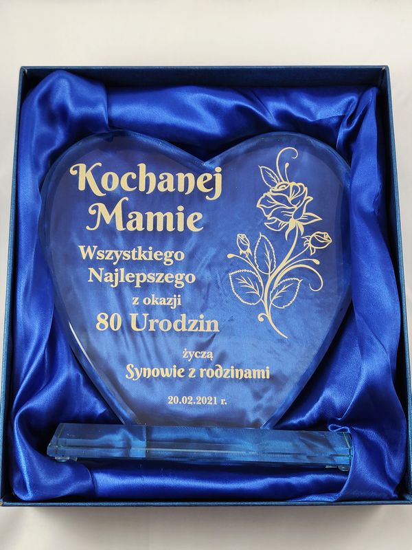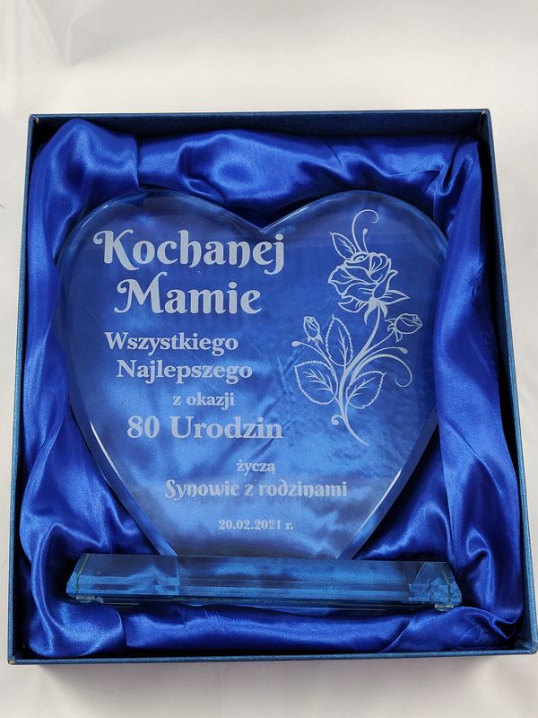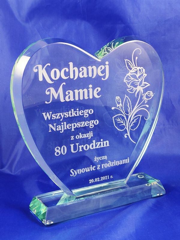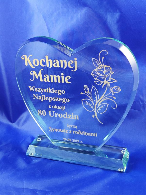 Pamiątkowy upominek dla Mamy w formie statuetki szklanej z grubego szkła w kształcie serca, z grawerem.