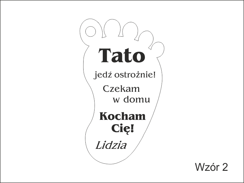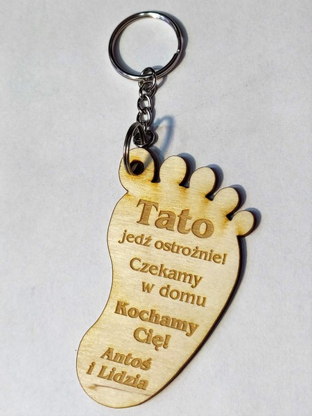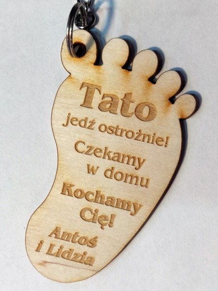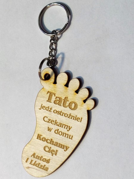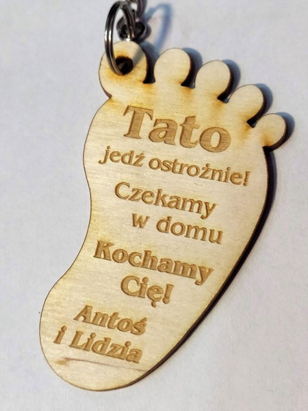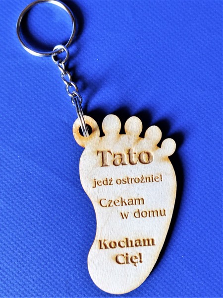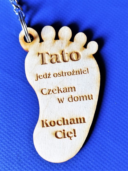 Upominek dla Taty w postaci drewnianego breloczka lub przywieszki "stopa".