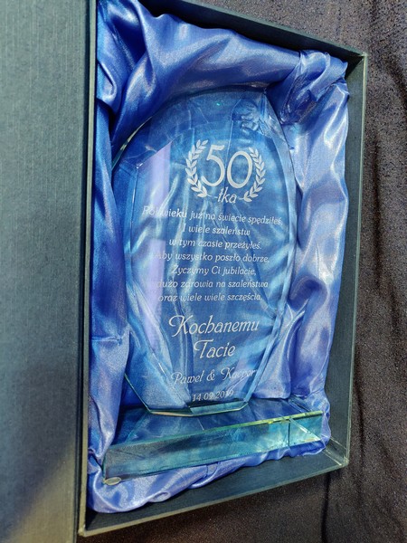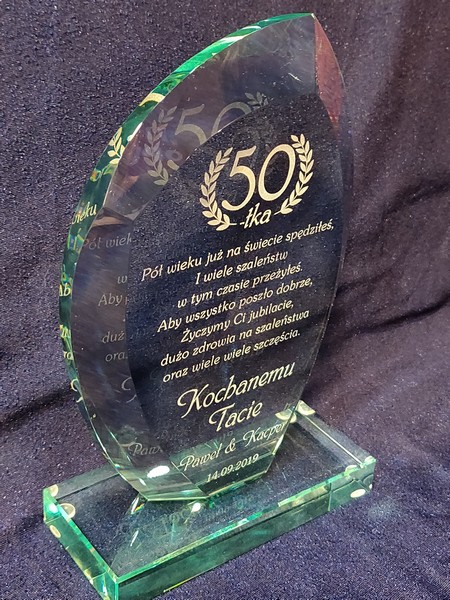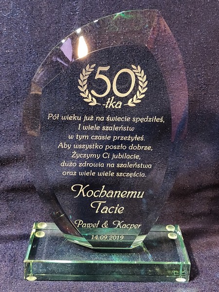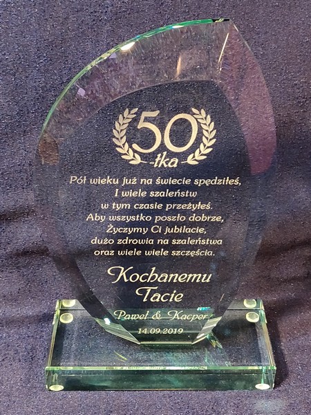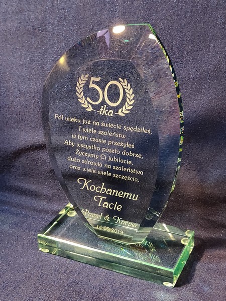 Pamiątkę szklaną w formie statuetki z grawerem dla taty można także wykonać na innych modelach statuetek szklanych.