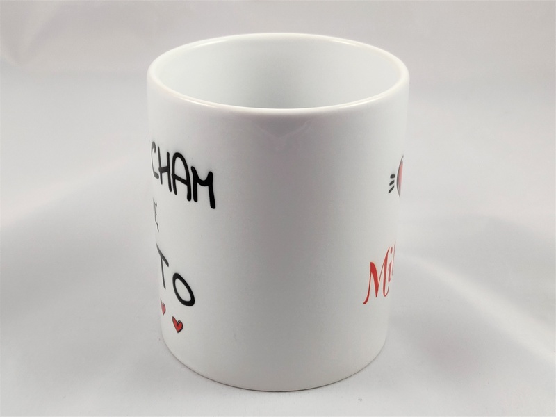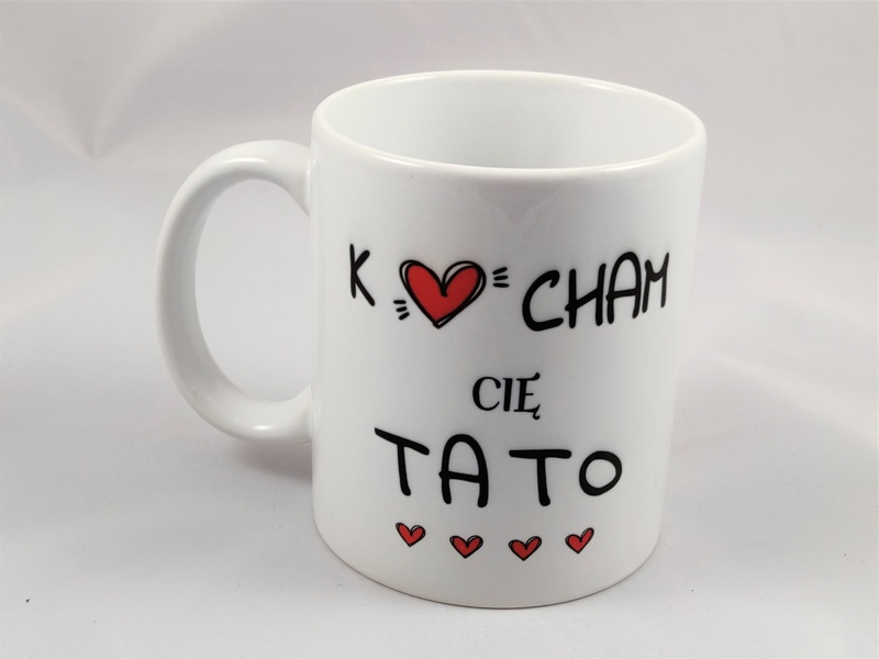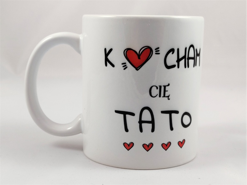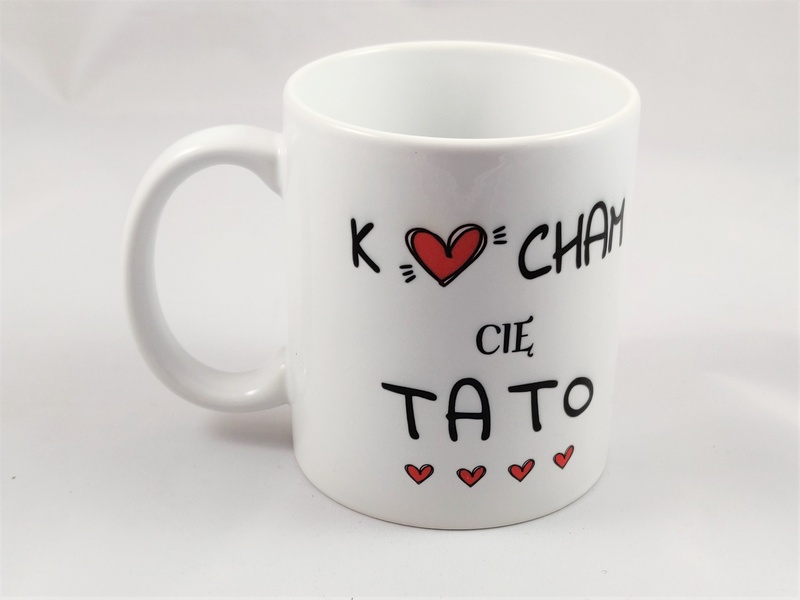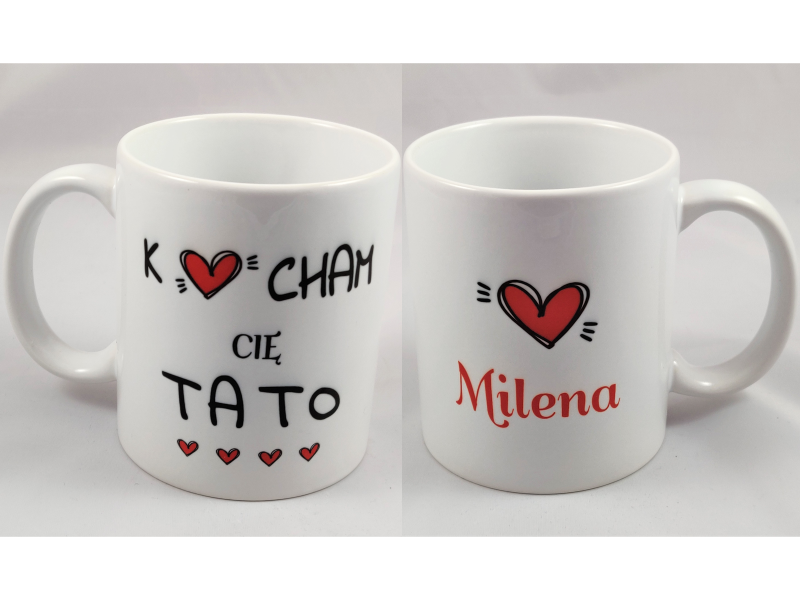 Nadruk na kubku z dedykacją "Kocham Cię Tato" oraz imieniem dziecka wykonany jest po obu stronach kubeczka.