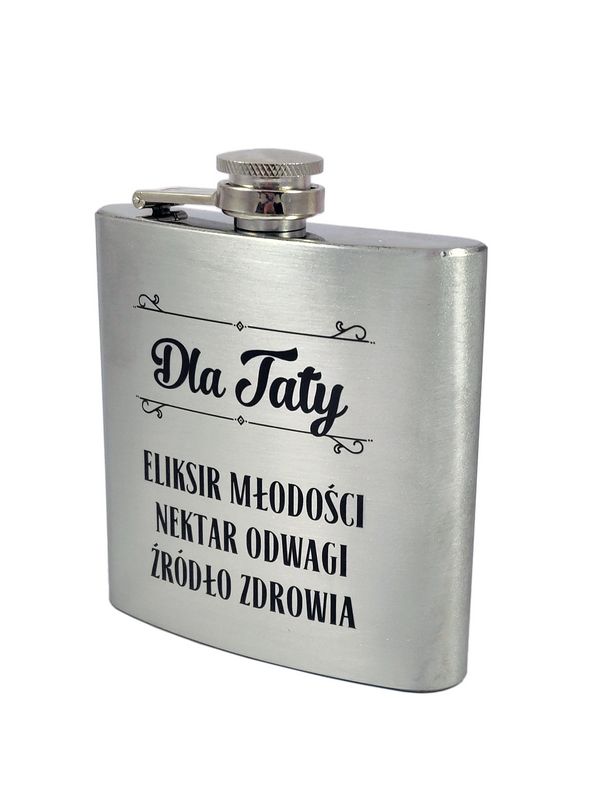 Na piersiówce wykonany jest grawer dedykacji: "Dla Taty. Eliksir Młodości, Nektar Odwagi, Źródło Zdrowia".