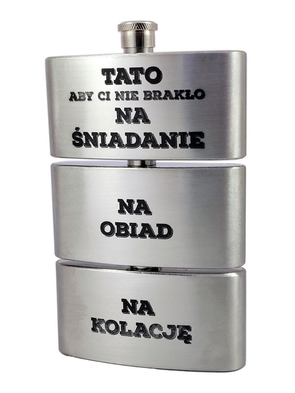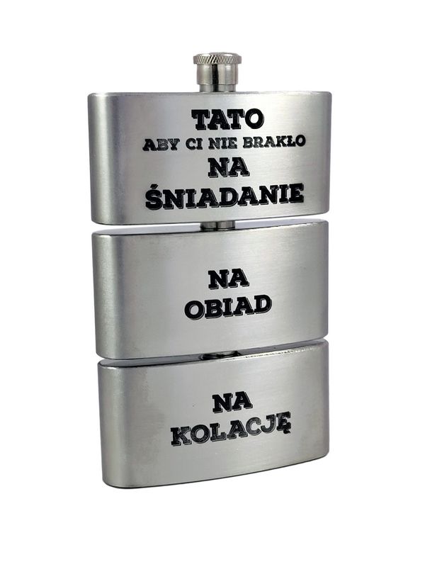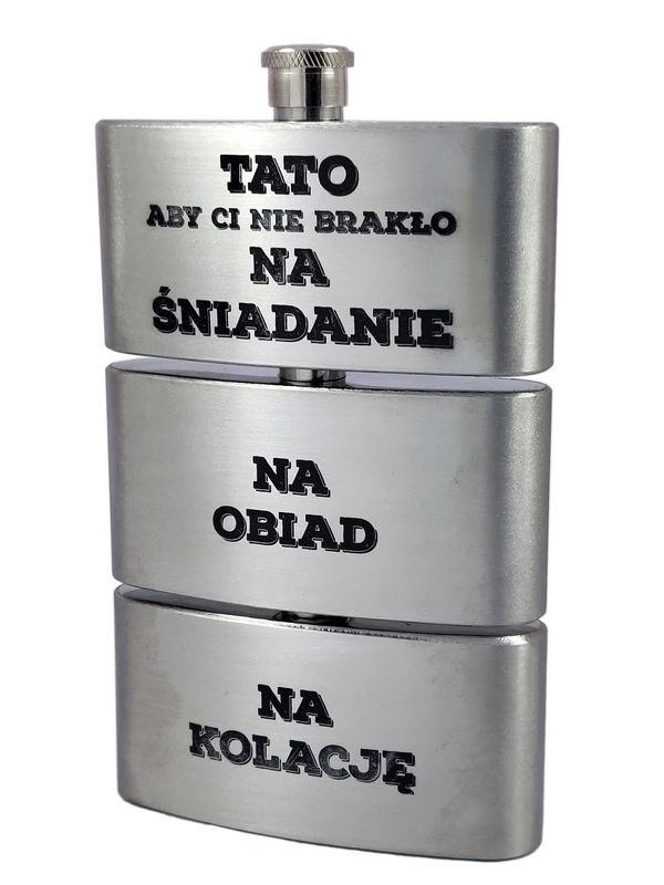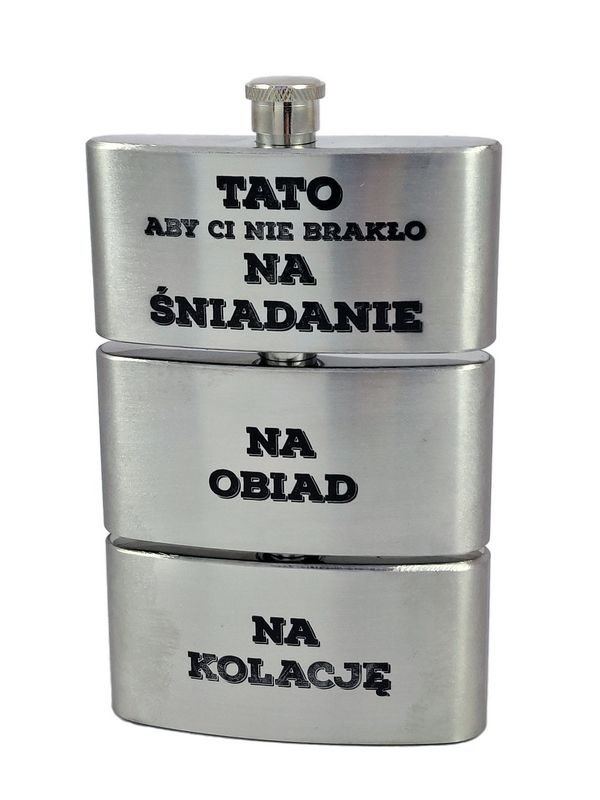 Upominek dla Taty w formie metalowej trójdzielnej piersiówki ze stali nierdzewnej z grawerem dedykacji.