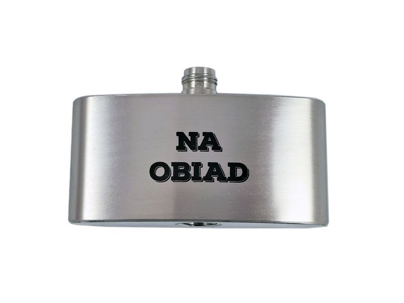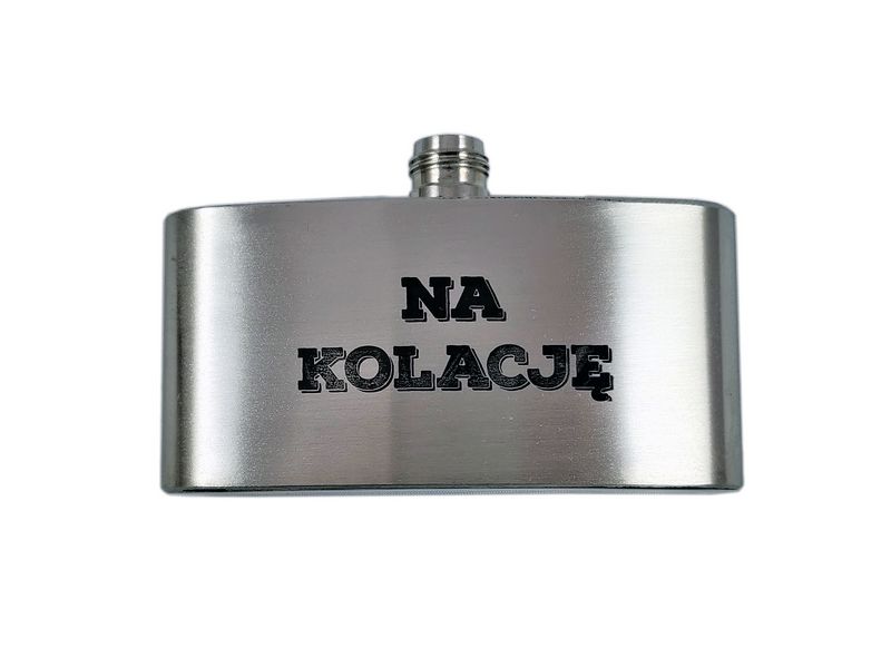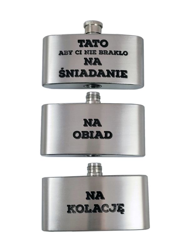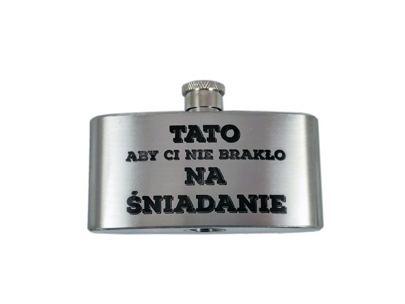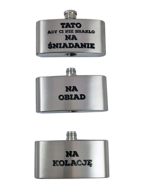 Na piersiówce wykonany jest żartobliwy grawer dedykacji: "Tato aby Ci nie brakło. Na śniadanie. Na obiad. Na kolację".