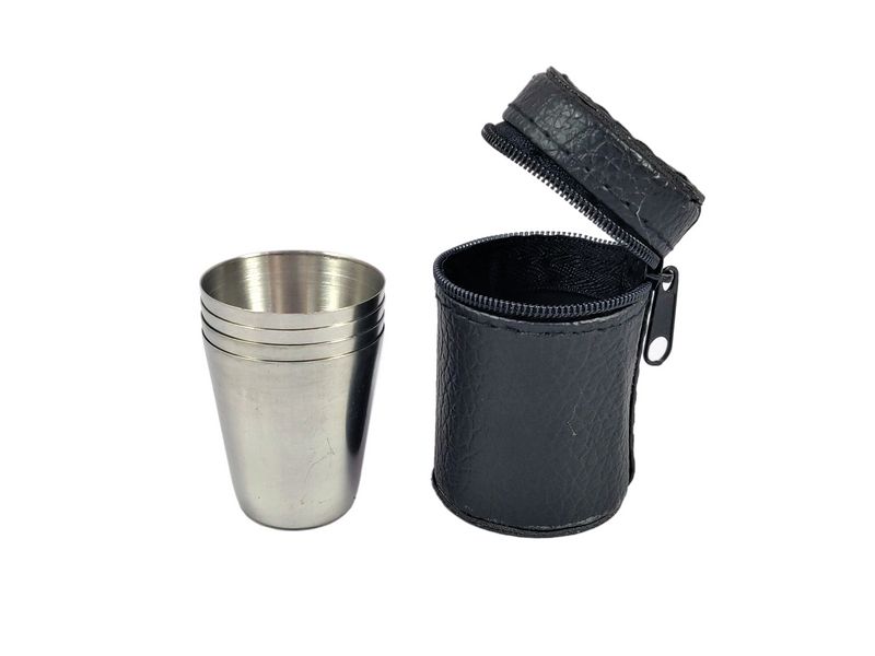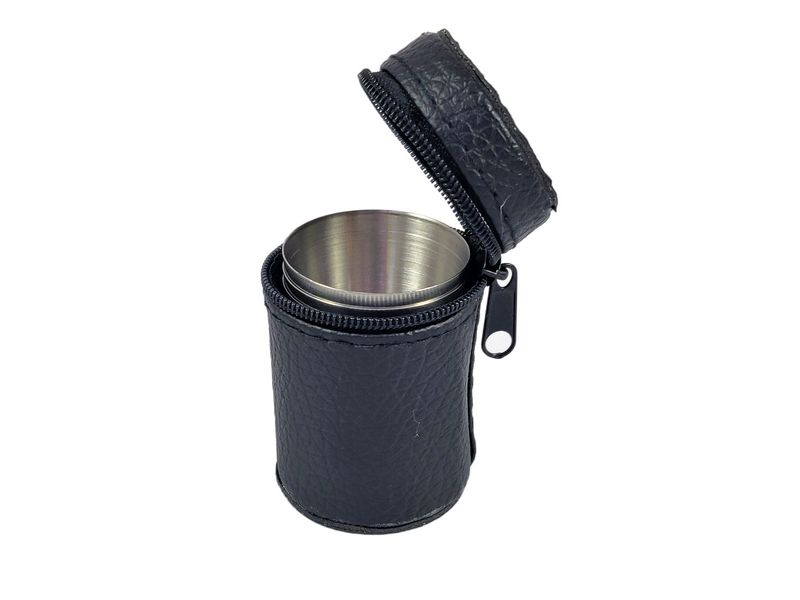 Kieliszki mają pojemność 20 ml (śr. 38 mm, wys. 5 cm) i zapakowanych są w zgrabny czary futerał z ekoskóry zasuwany na zamek.
