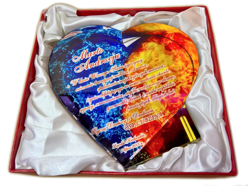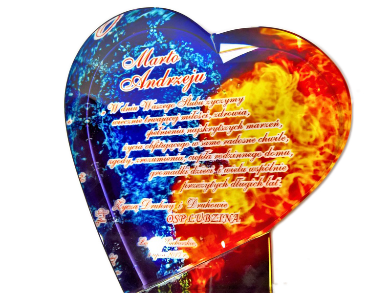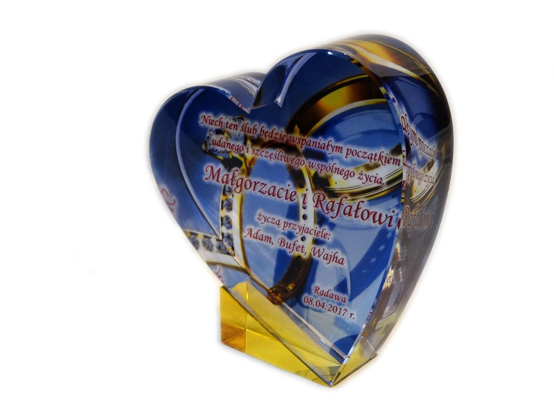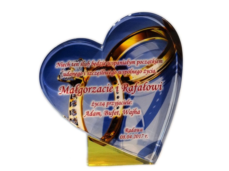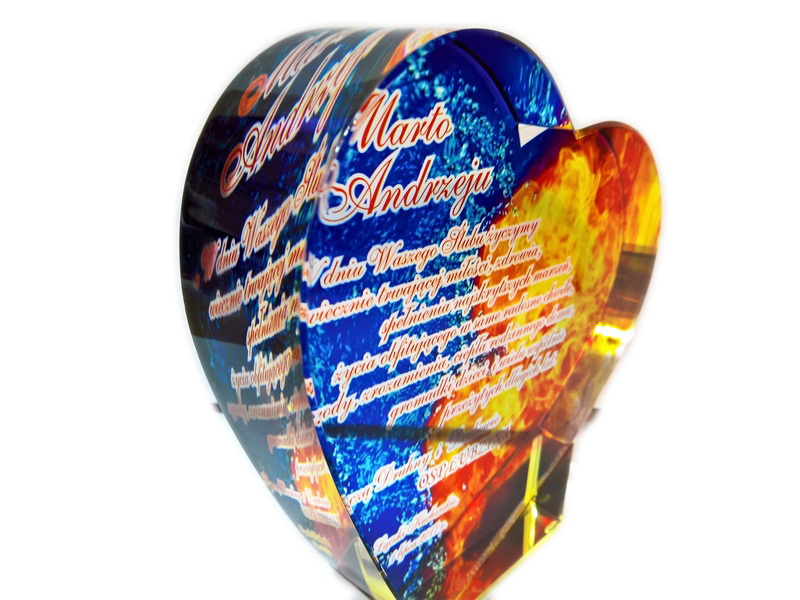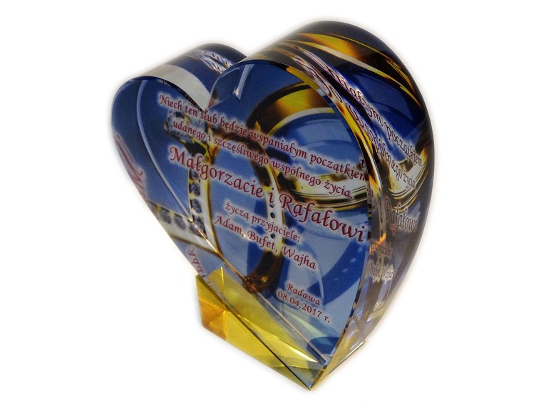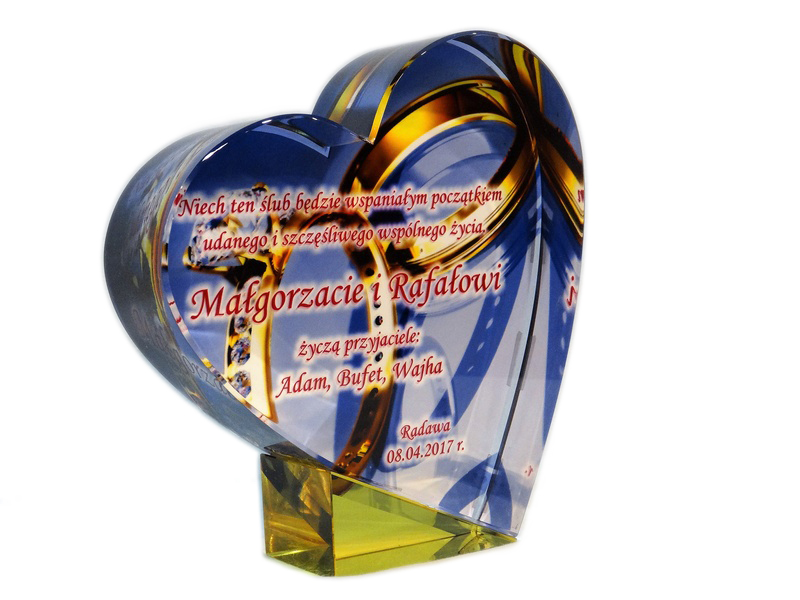 Pamiątkowy upominek na ślub w formie statuetki szklanej C055 "serce" z grubego szlifowanego szkła z nadrukiem.