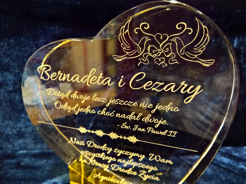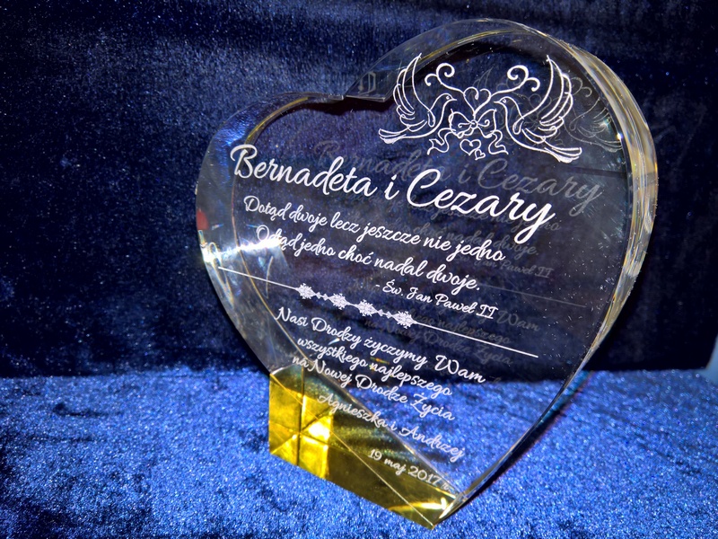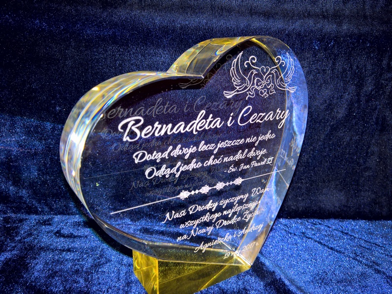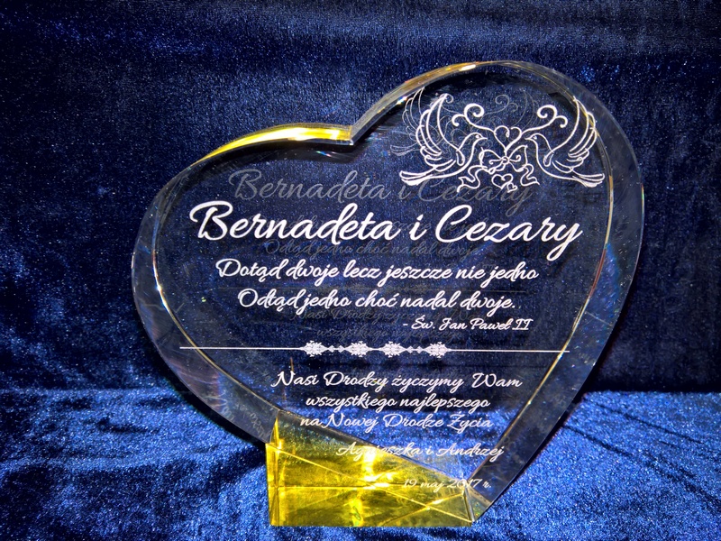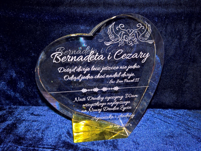 Pamiątkę ślubną z grawerem można także wykonać na innych modelach statuetek szklanych.