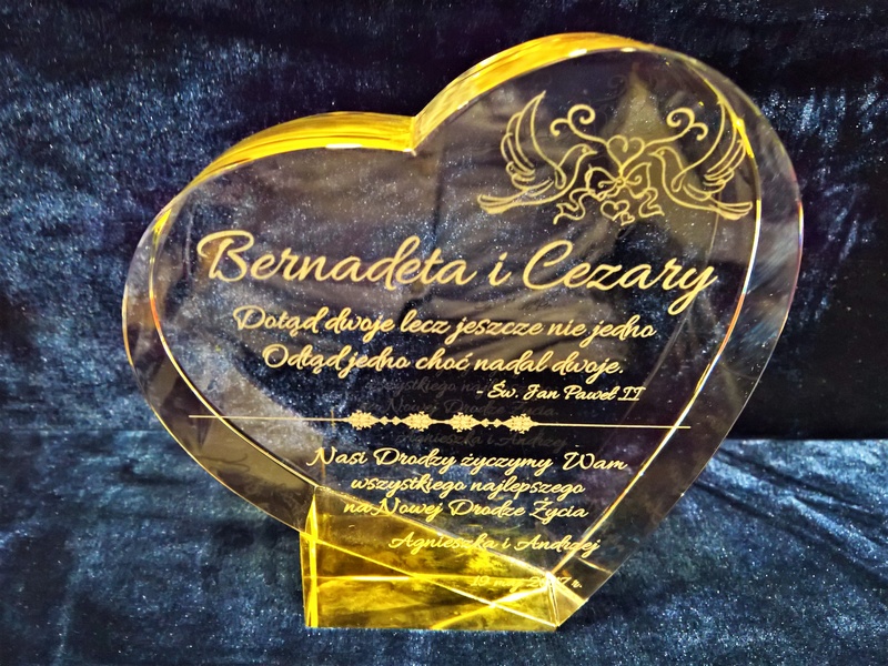 Pamiątkowa statuetka szklana C055 w kształcie serca, z grubego szlifowanego szkła z okolicznościowym grawerem z okazji Ślubu.