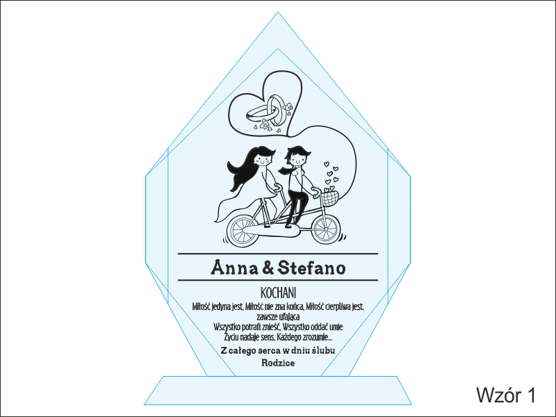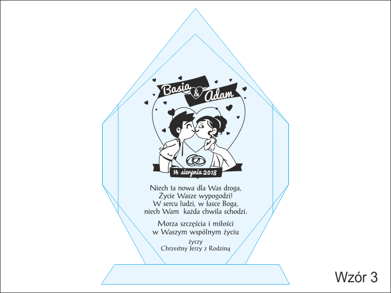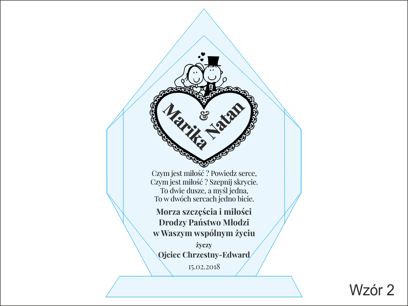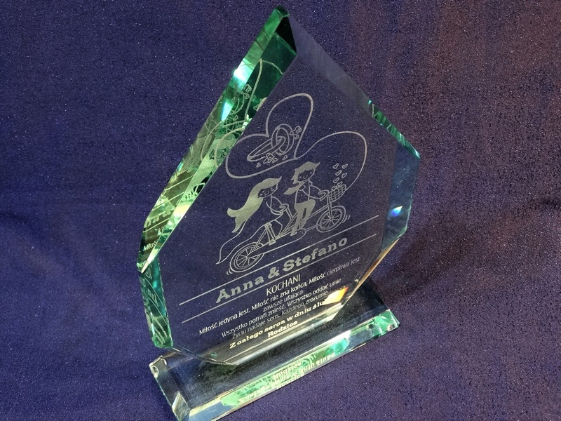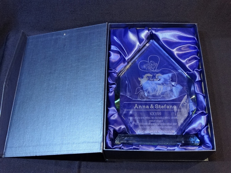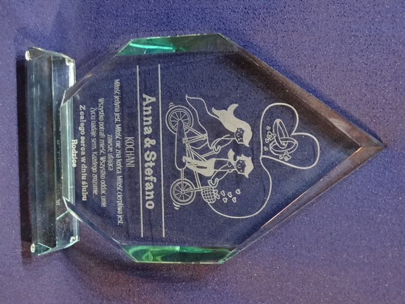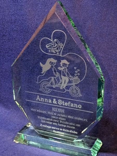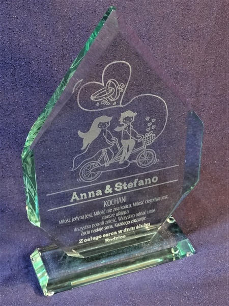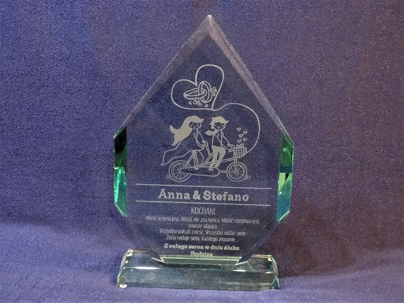 Pamiątkę ślubną z grawerem można także wykonać na innych modelach statuetek szklanych.
