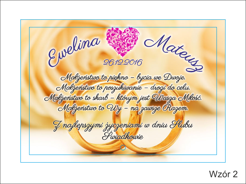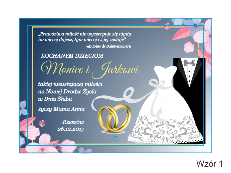 Na statuetce wykonany jest nadruk ozdobnych grafik i dedykacji na pamiątkę ślubu.