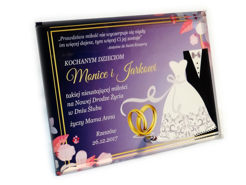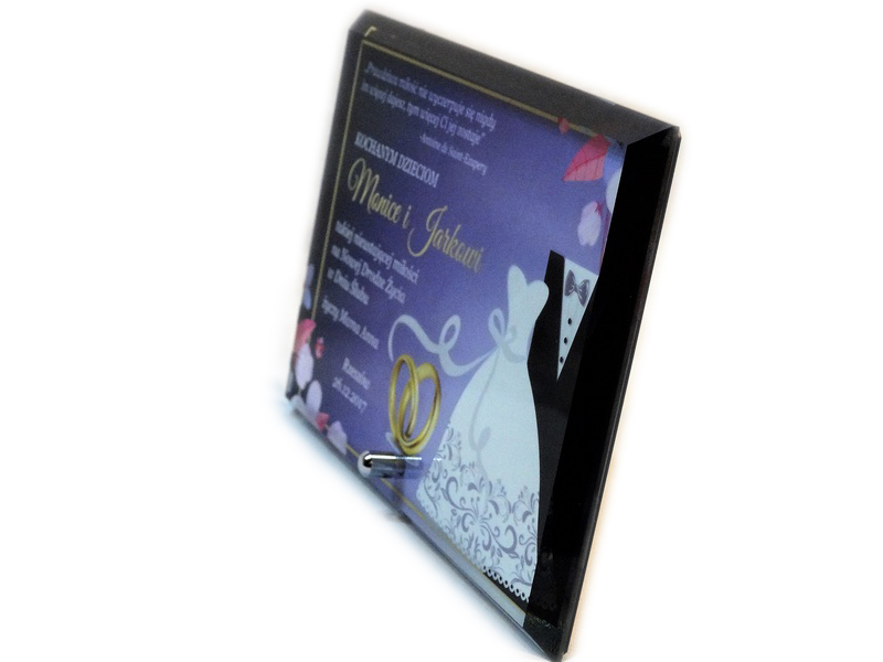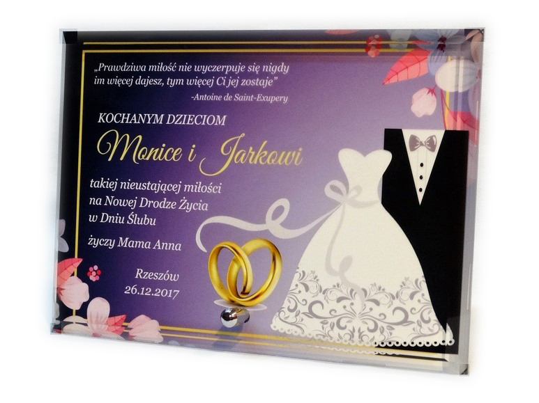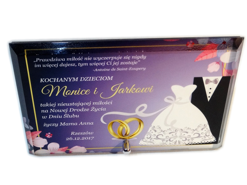 Pamiątkowy upominek ślubny w formie statuetki szklanej z grubego szkła w prostokątnym poziomym kształcie z nadrukiem.