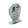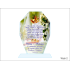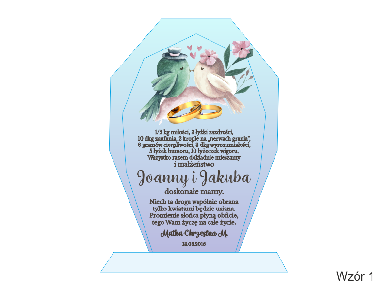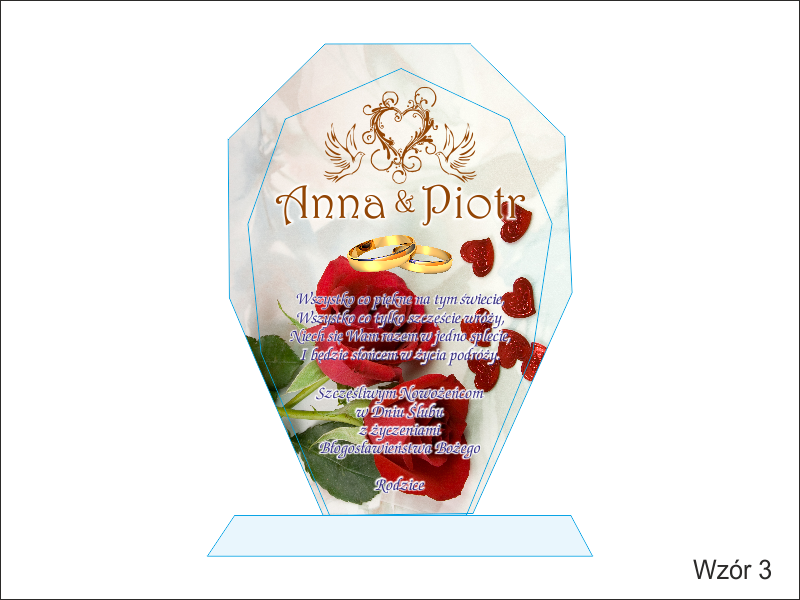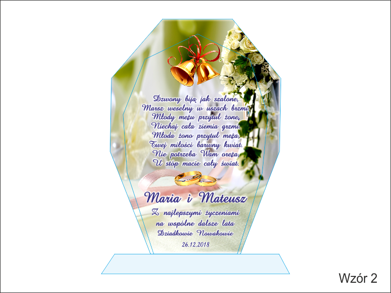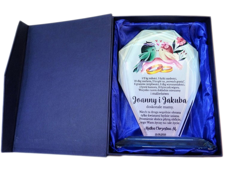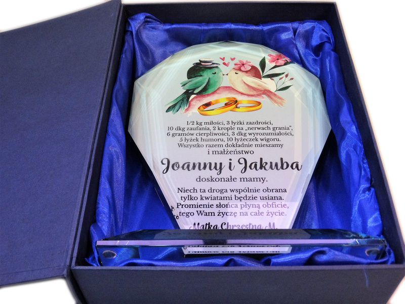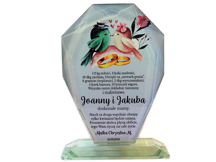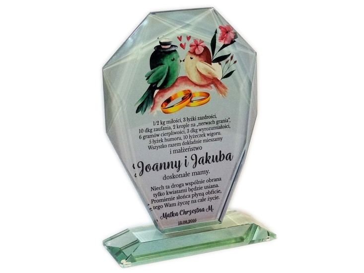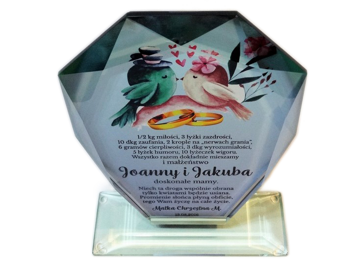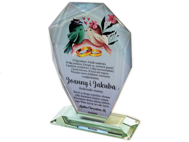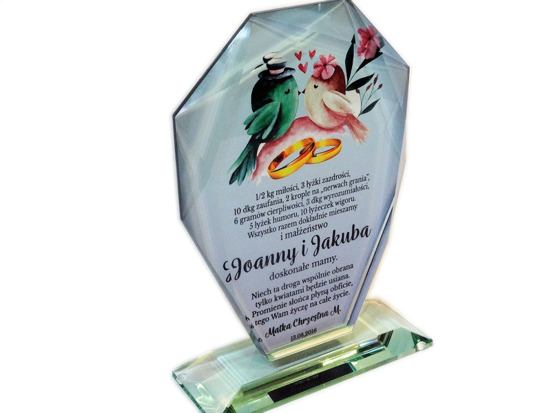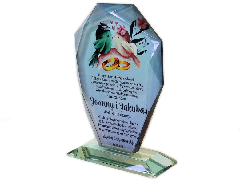 Statuetka szklana z grubego szkła w kształcie szlifowanego wyciągniętego ośmioboku z nadrukiem dedykacji i ozdobnych grafik z okazji Ślubu.