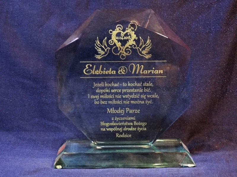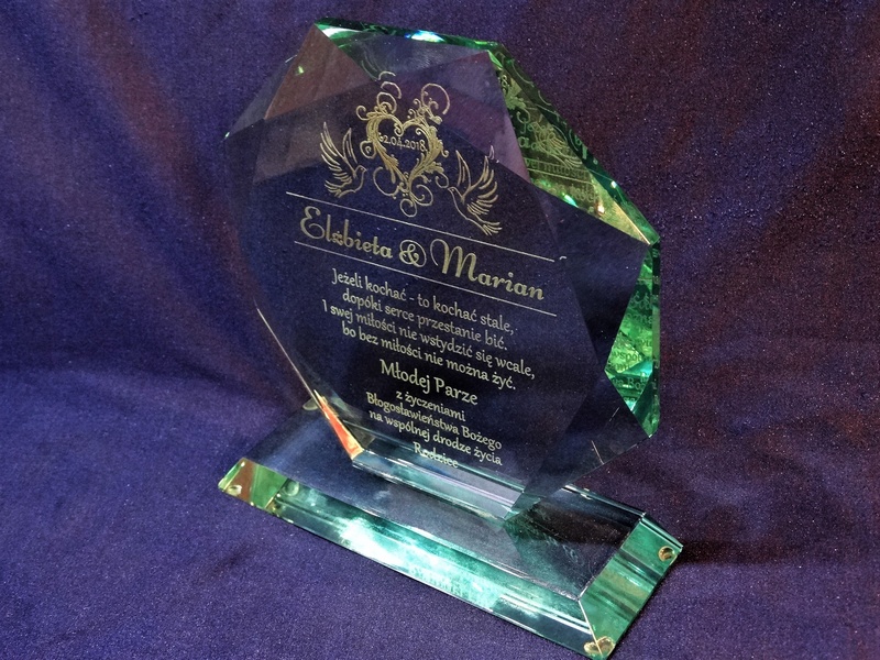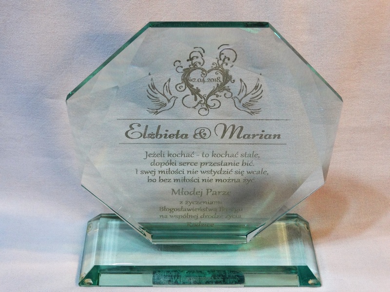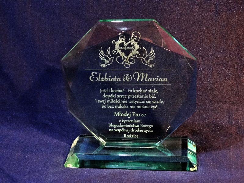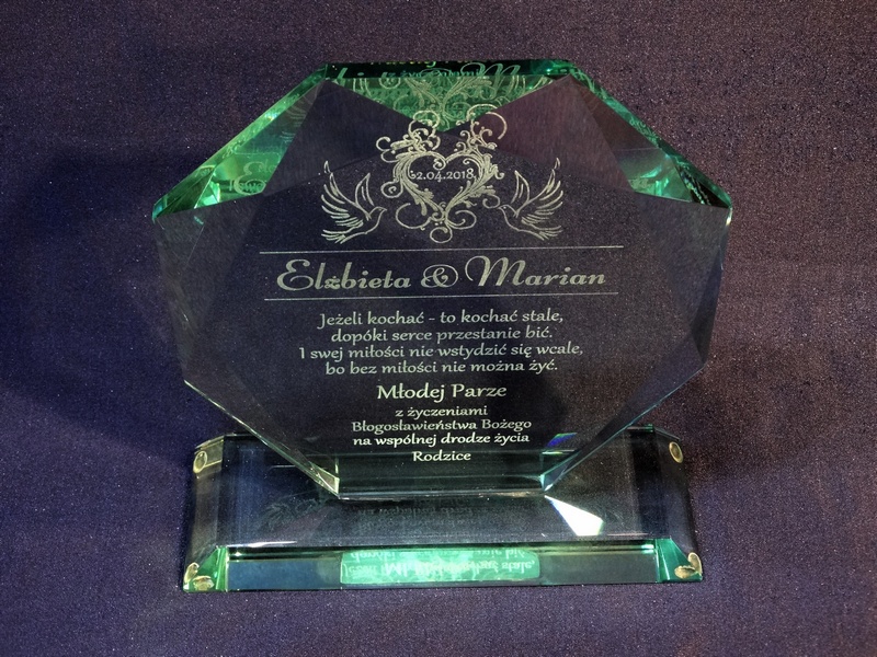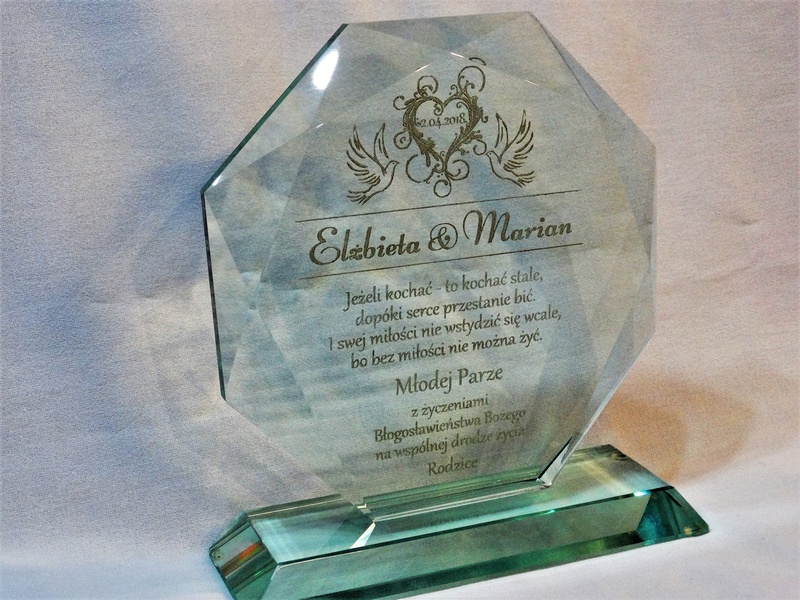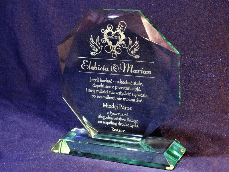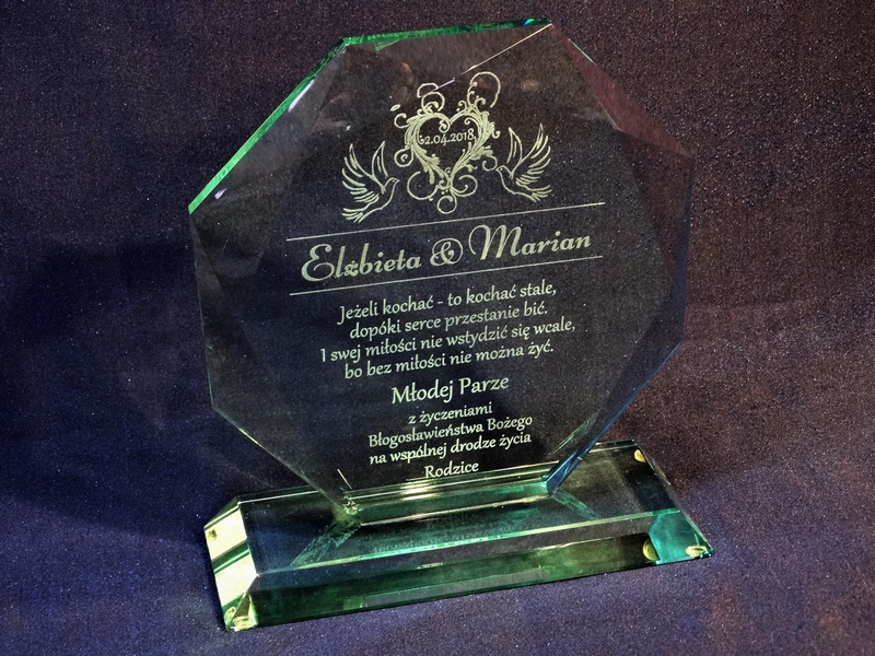 Pamiątkowa statuetka szklana z okazji Ślubu w kształcie szlifowanego ośmioboku z grubego szkła z grawerem dedykacji i ozdobnych grafik.