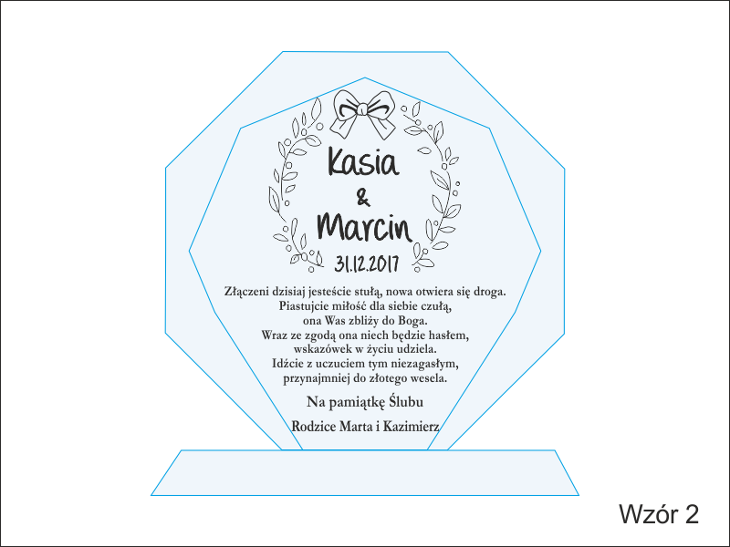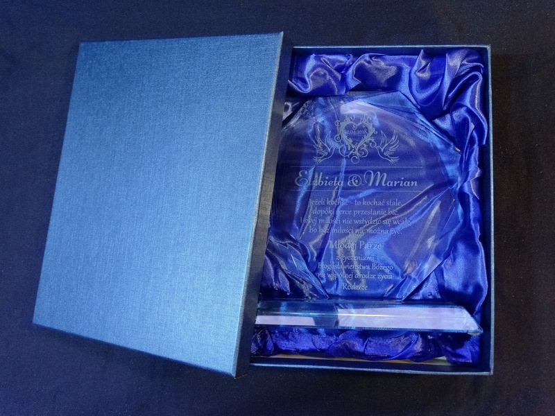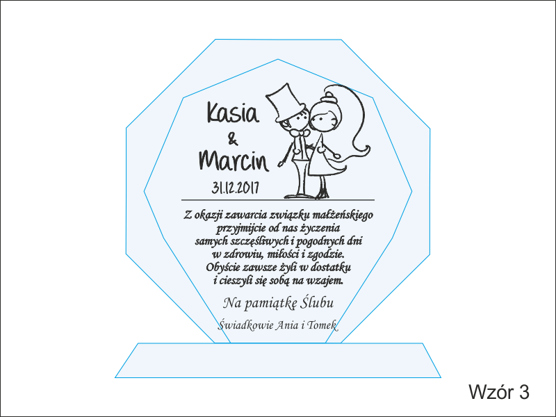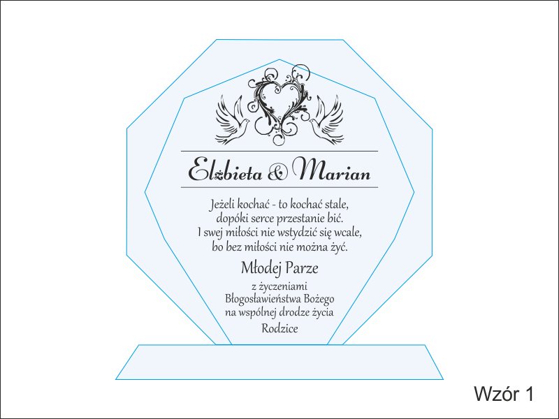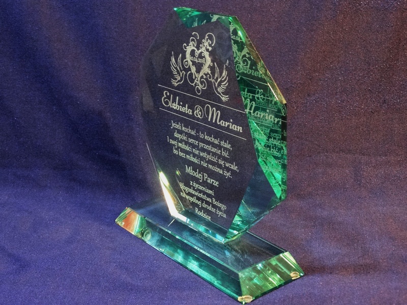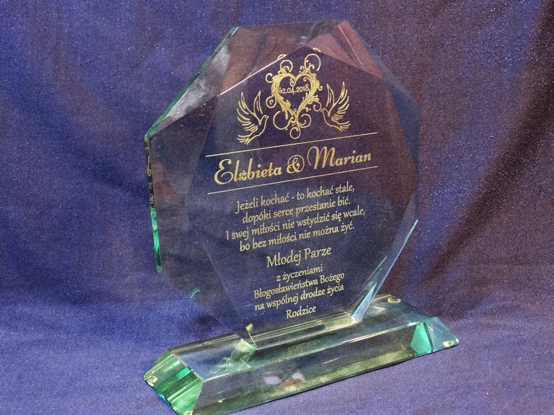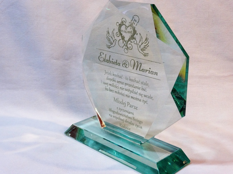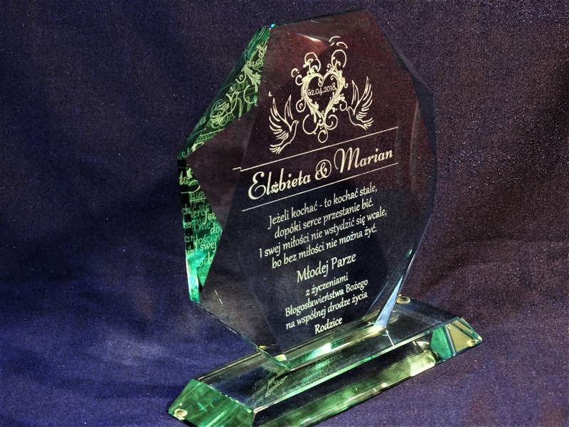Pamiątkowa statuetka szklana z okazji Ślubu w kształcie szlifowanego ośmioboku z grubego szkła z grawerem dedykacji i ozdobnych grafik.