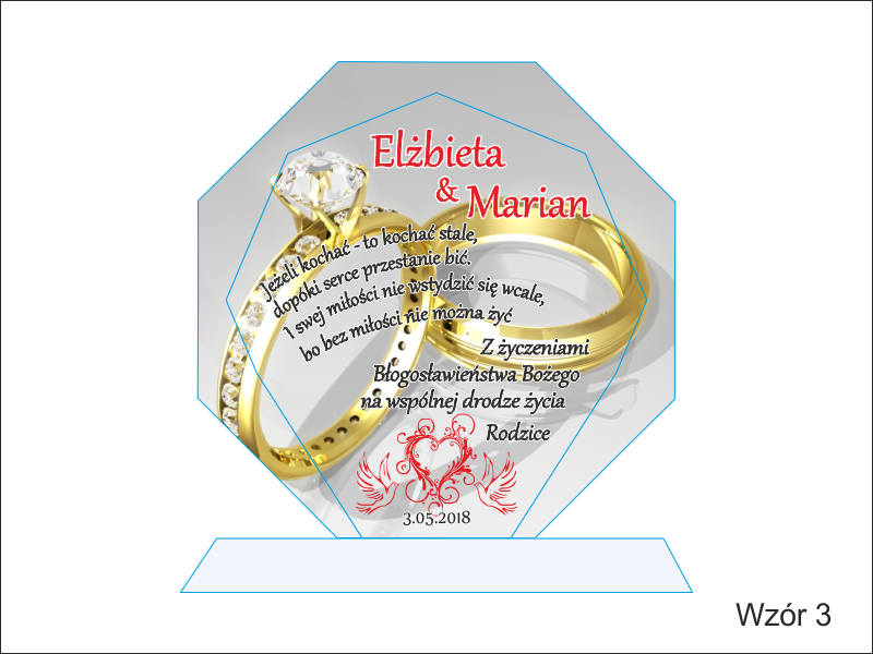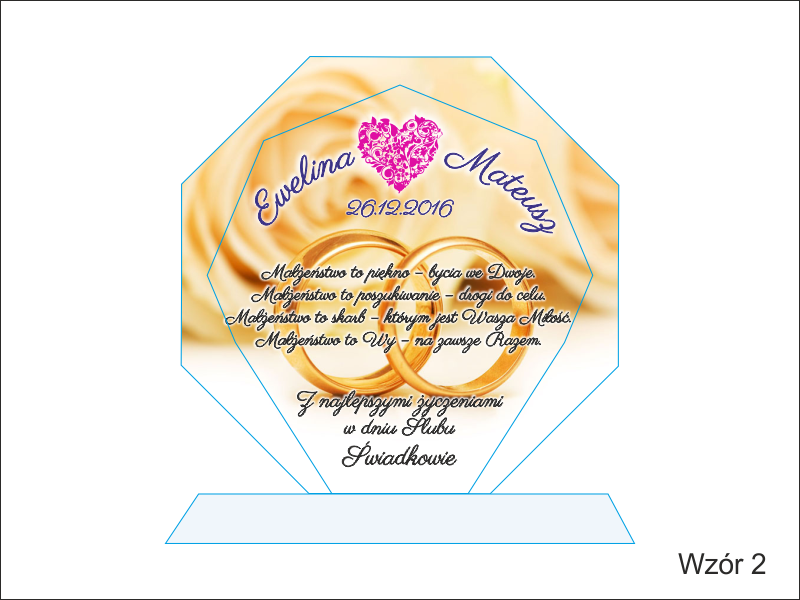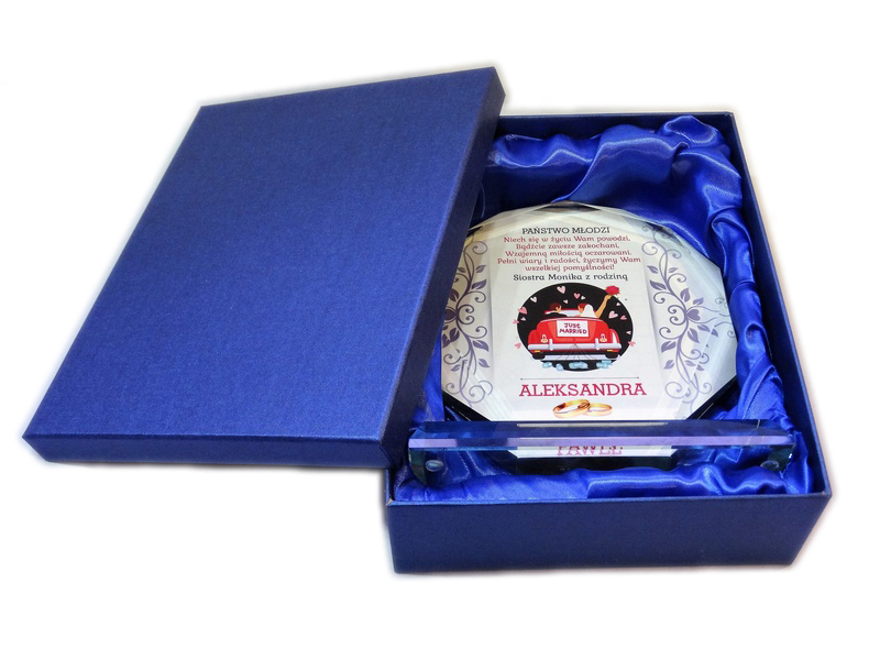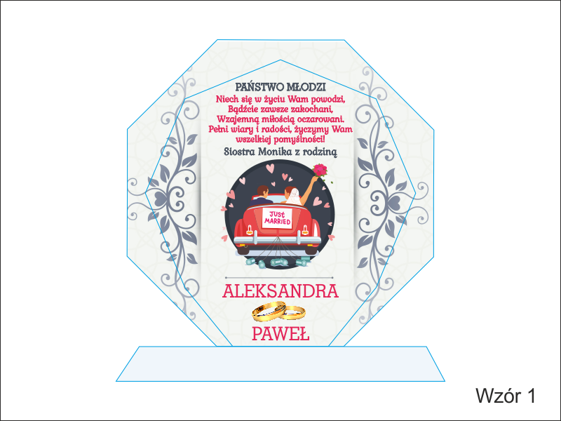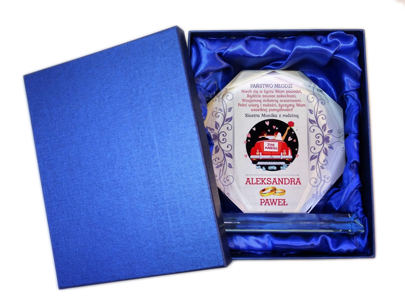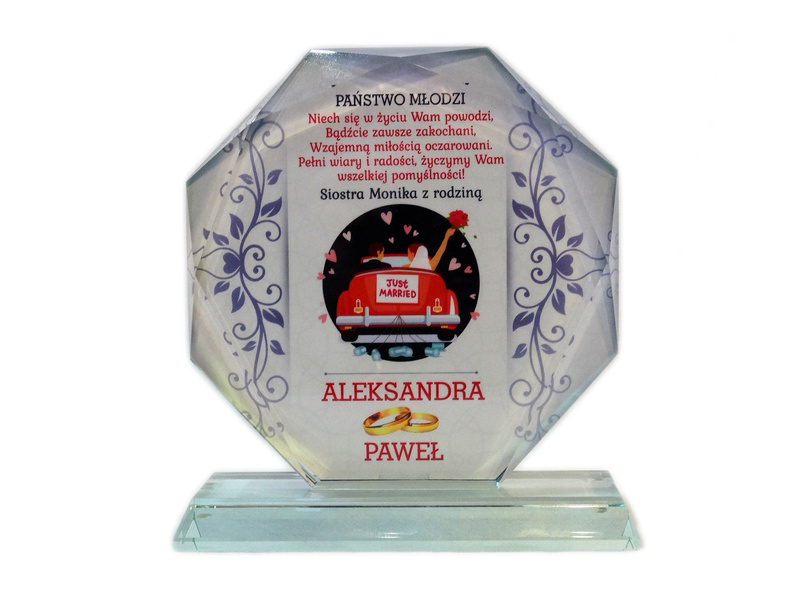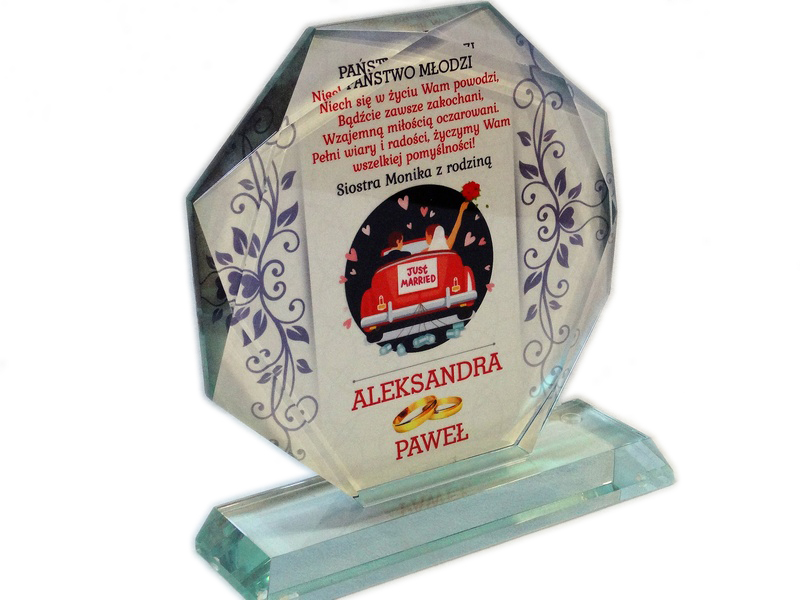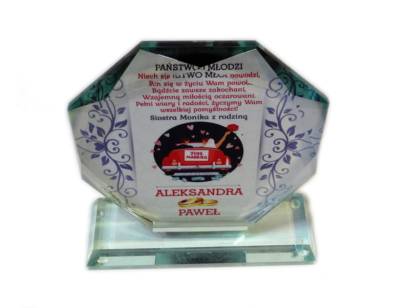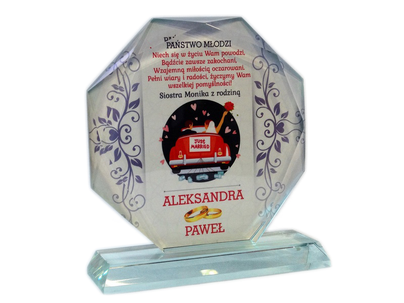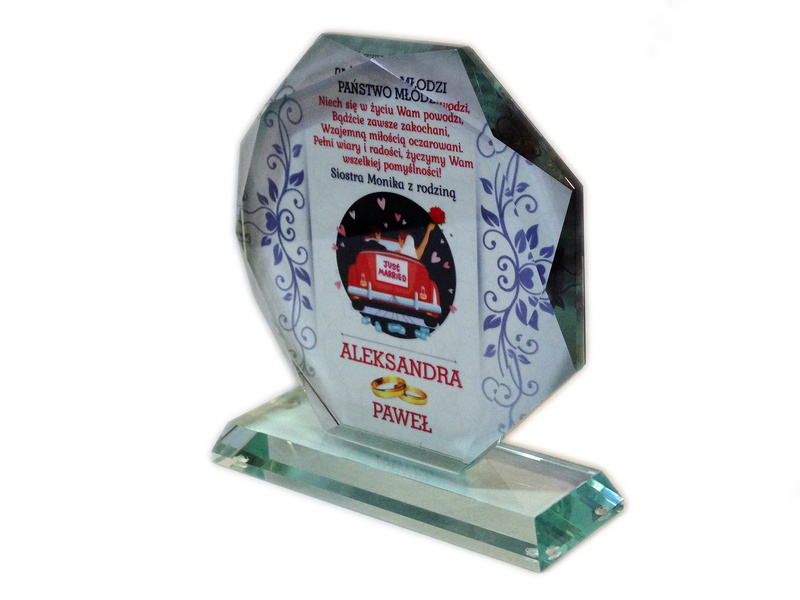 Statuetka szklana z grubego szkła w kształcie szlifowanego ośmioboku z nadrukiem dedykacji i ozdobnych grafik z okazji Ślubu.