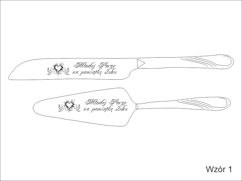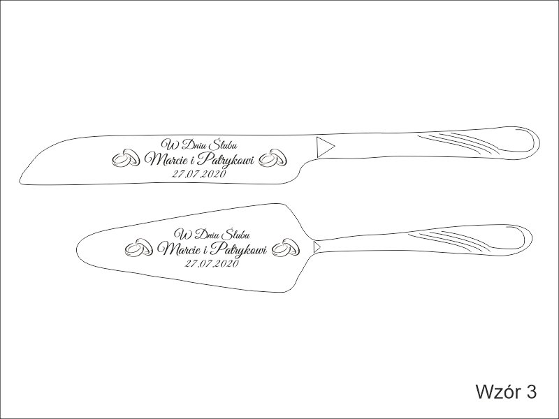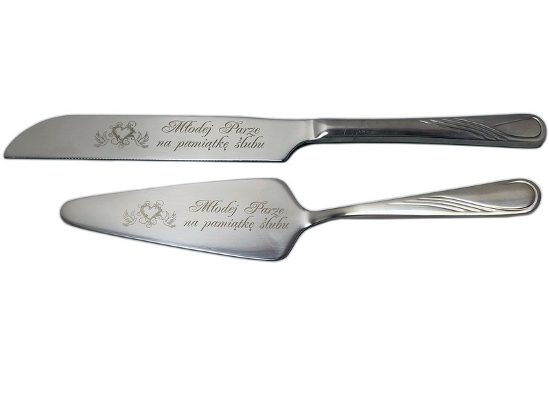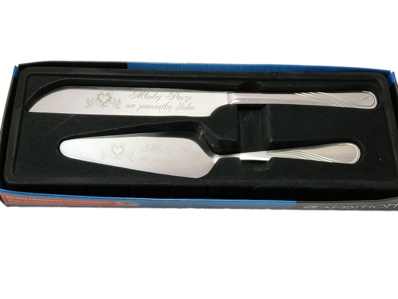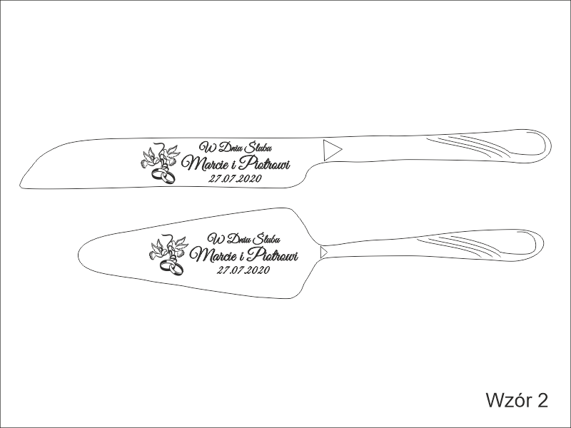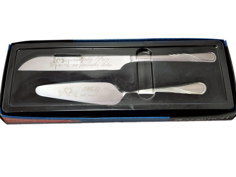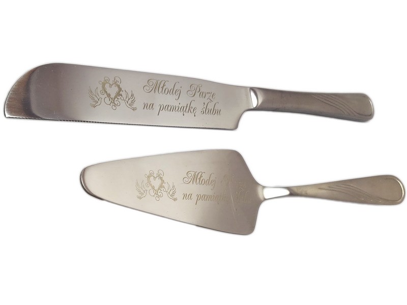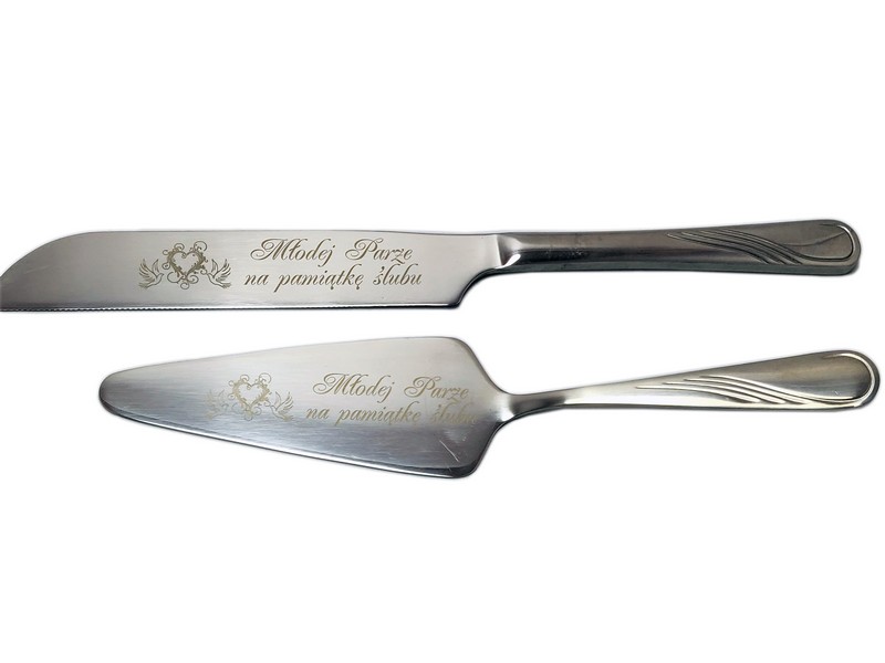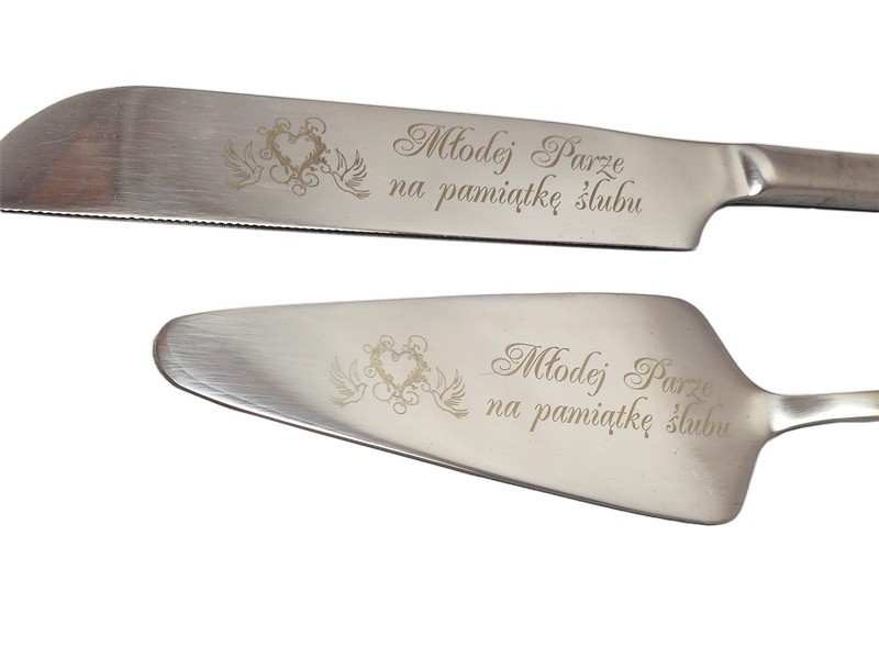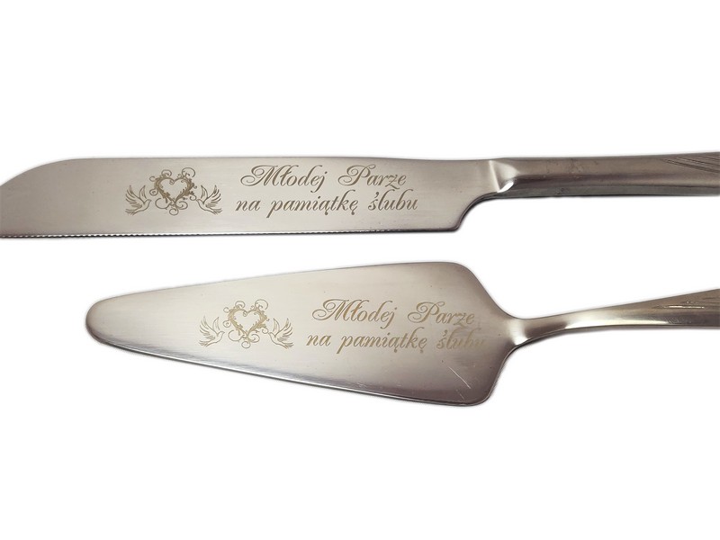 Grawer dedykacji wykonany jest bezpośrednio na łopatce i nożu do ciasta.