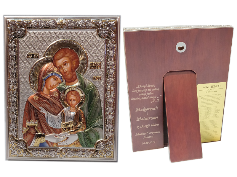 Prezent z okazji Ślubu w postaci kolorowej srebrnej ikony z wizerunkiem Św. Rodziny.
