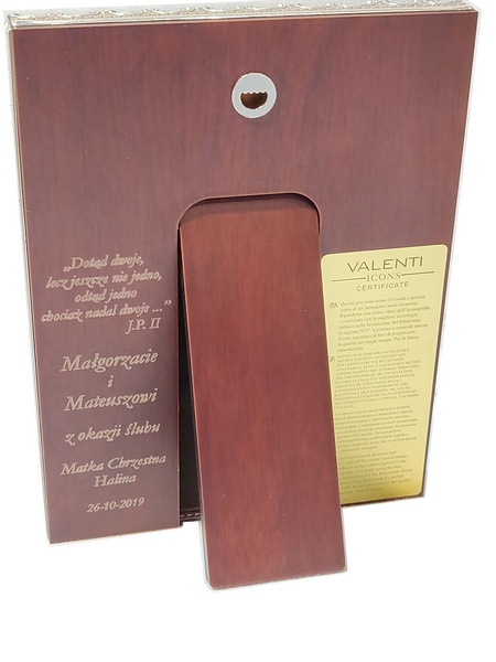 Ikona ma na odwrocie wygrawerowaną pamiątkową dedykację z okazji Ślubu.