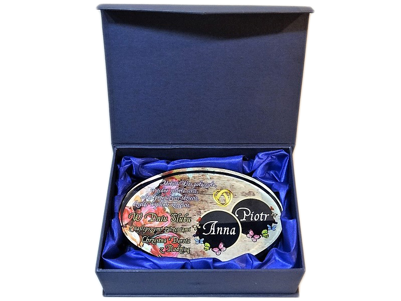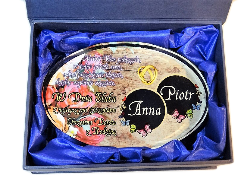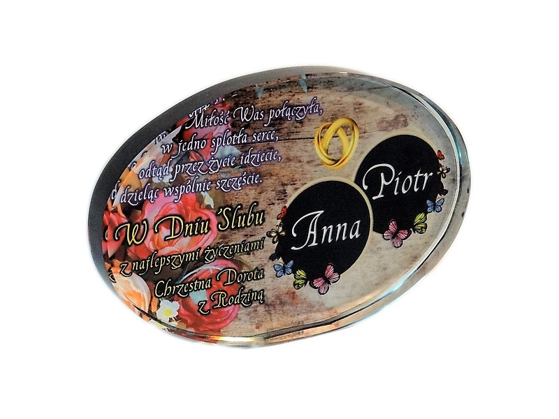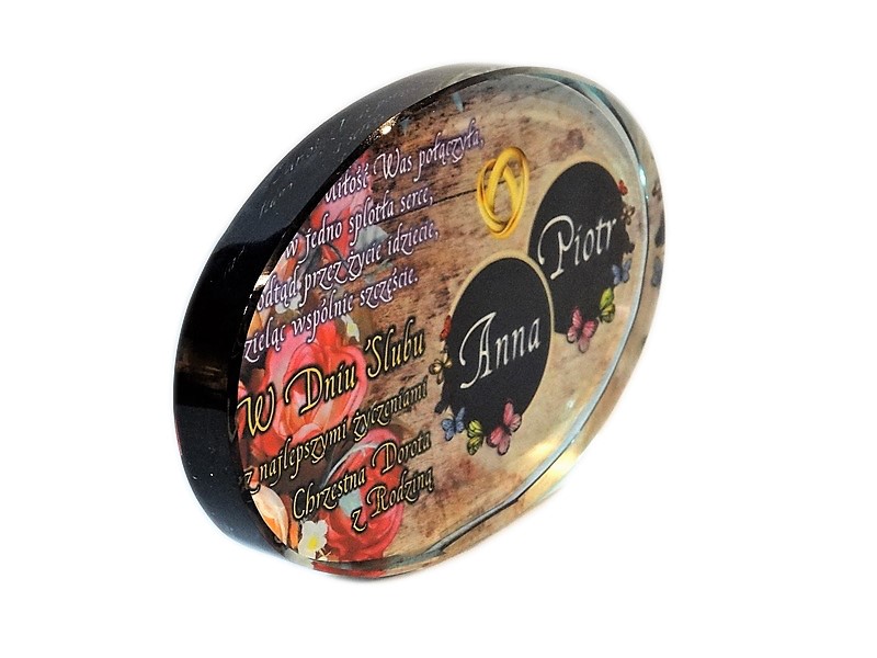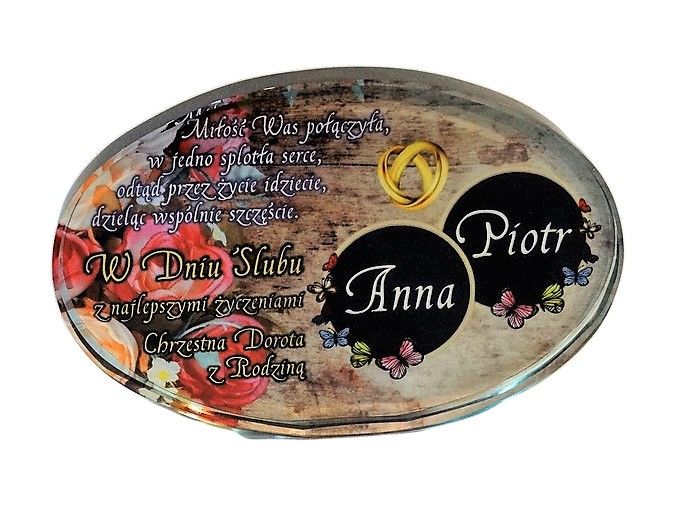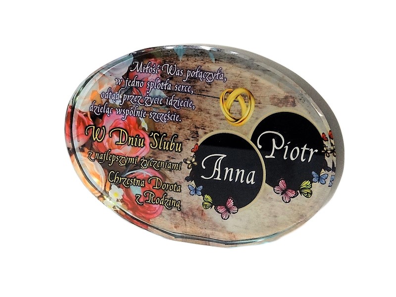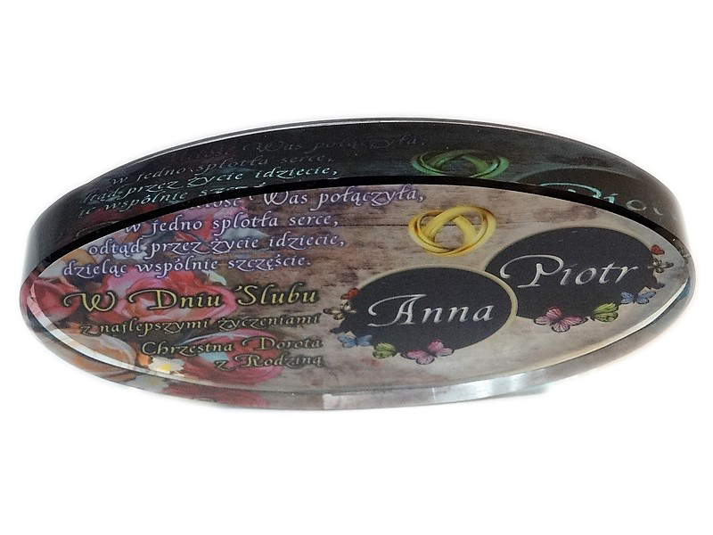 Pamiątkowa statuetka szklana w owalnym eliptycznym kształcie z grubego szkła z nadrukiem dedykacji i ozdobnych grafik z okazji Ślubu.