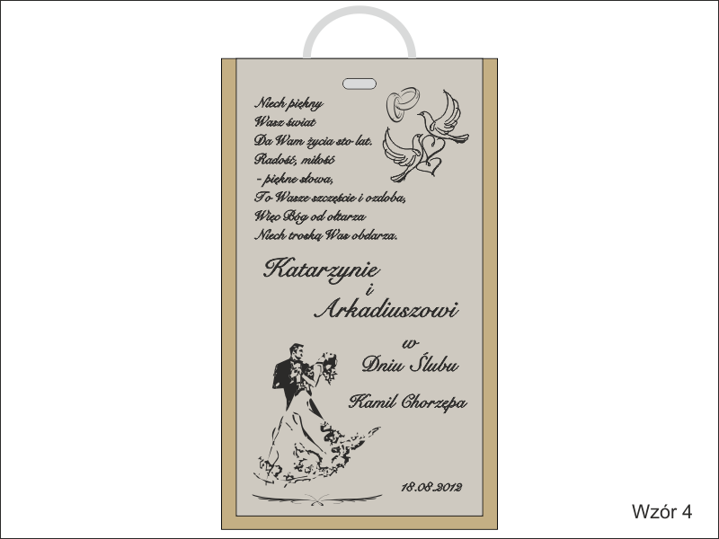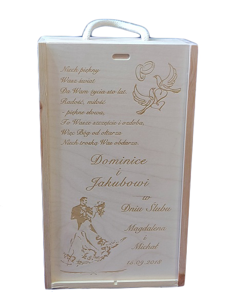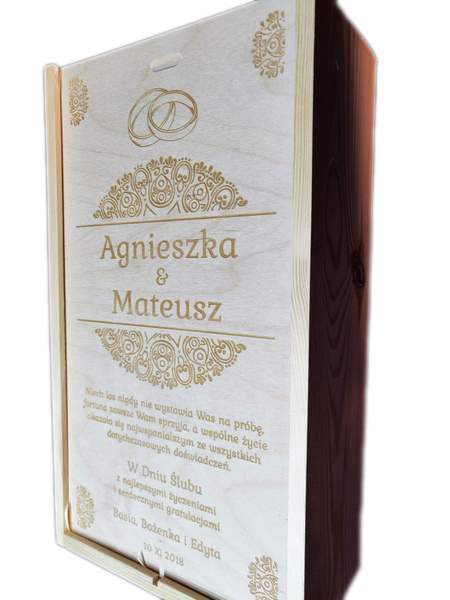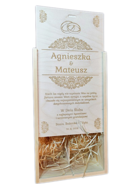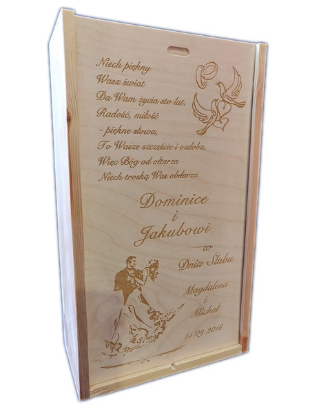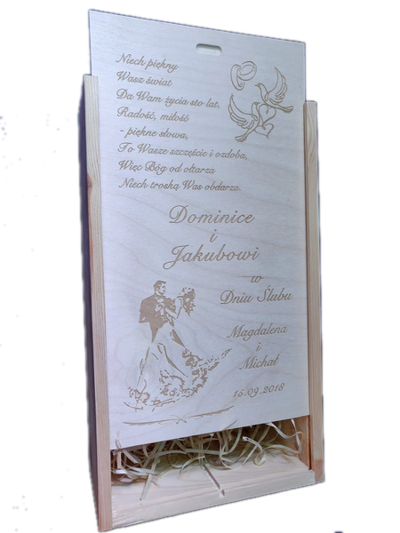 Na skrzynce wykonany jest pamiatkowy grawer dedykacji z okazji zawarcia związku małżeńskiego.