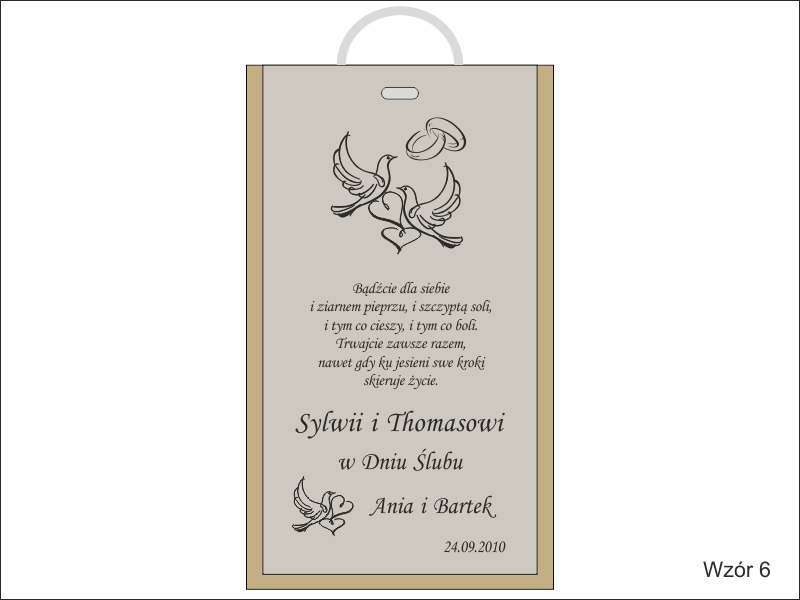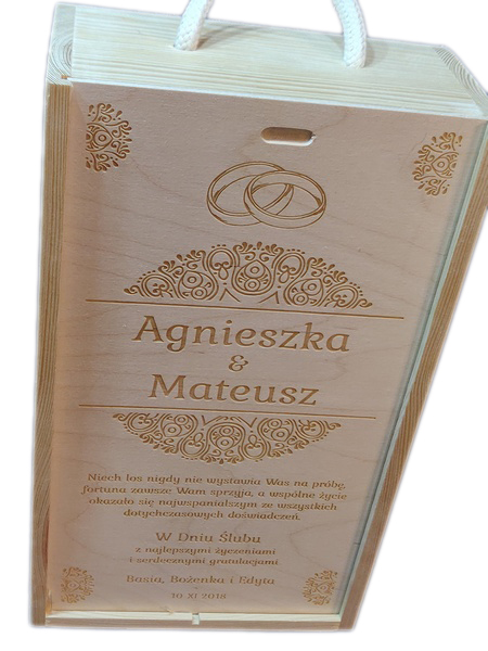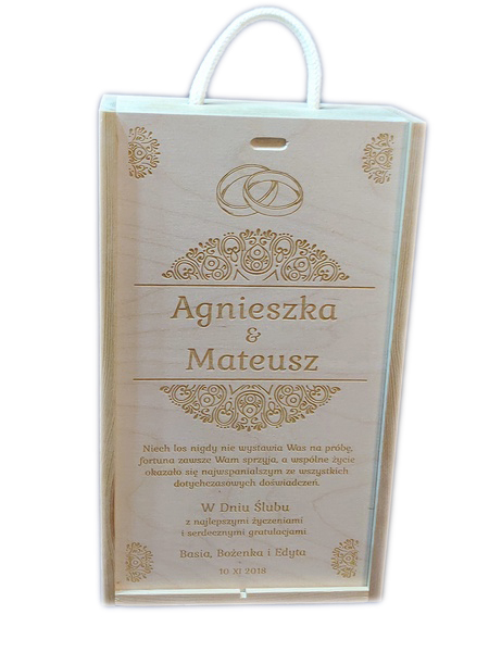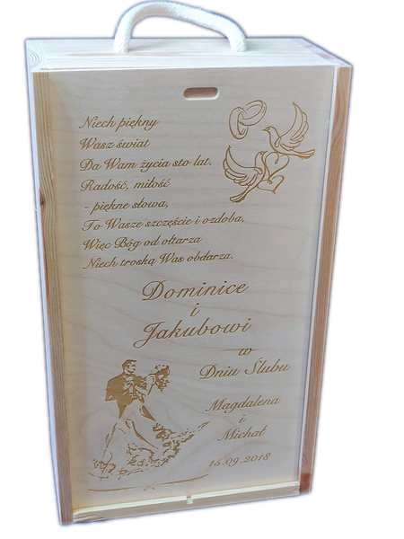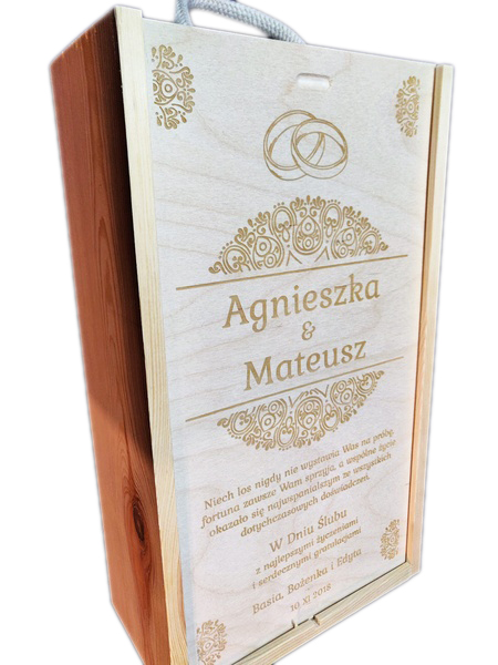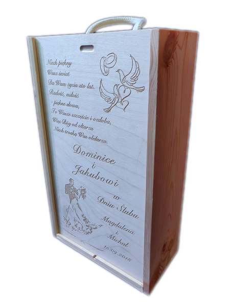 Skrzynka z powodzeniem pomieści dwie standardowe butelki wina, wódki czy innego trunku - jedną dla Panny Młodej, drugą dla Pana Młodego. Dla tak zapakowanych butelek będzie stanowić wyjątkową oprawę.