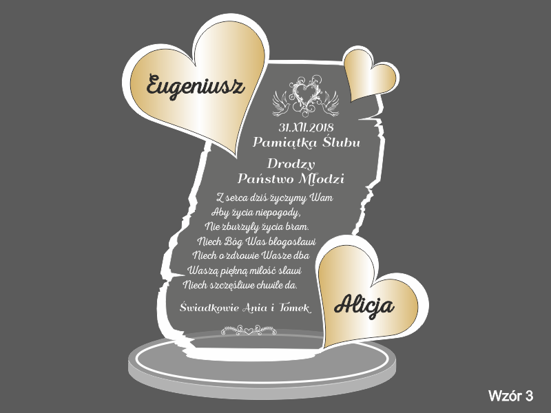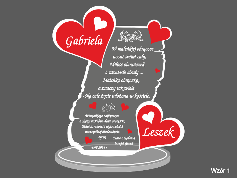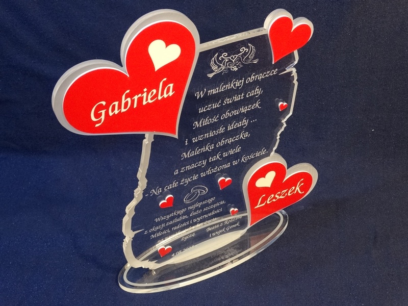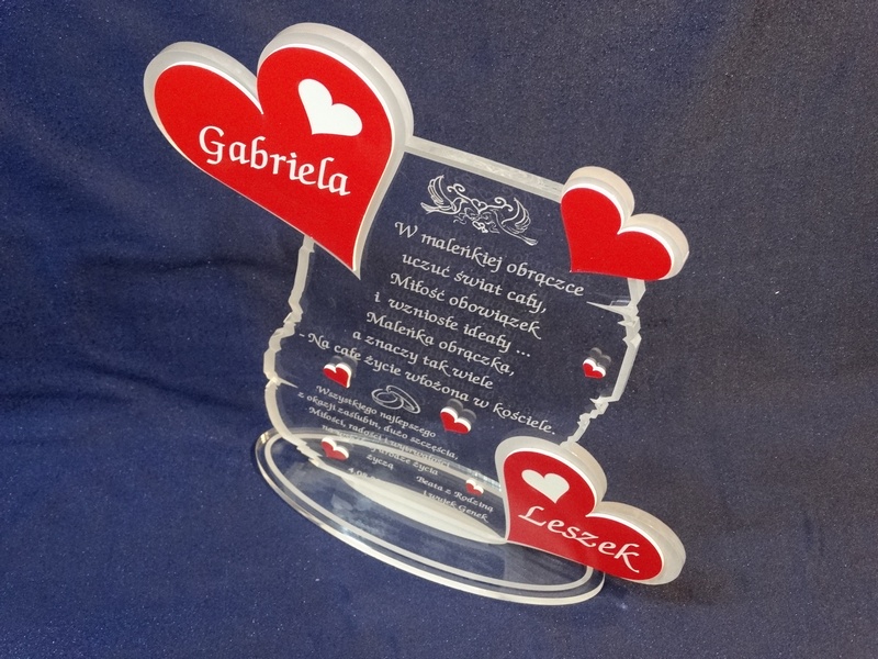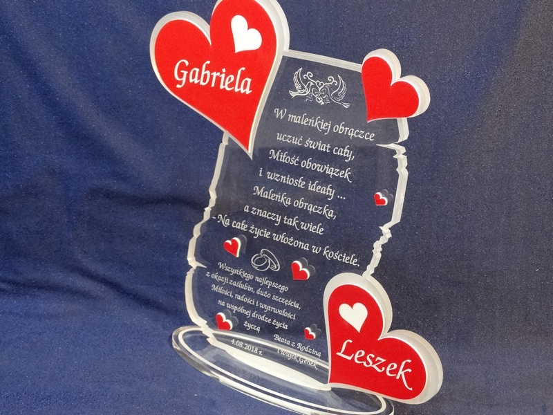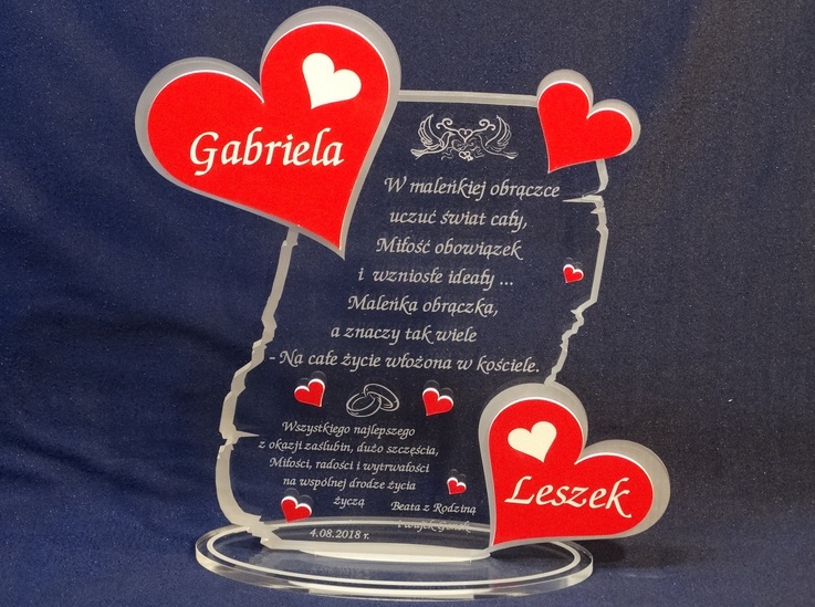 Na wyciętej z pleksy statuetce wykonany jest grawer dedykacji, życzeń oraz ozdobnej grafiki z okazji ślubu.