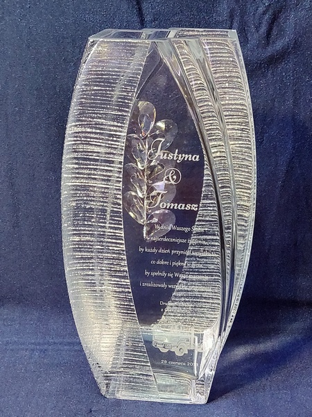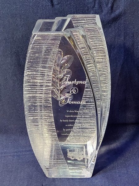 Intrygująca forma i zdobienie wazonu w połączeniu z dedykowanym pamiątkowym grawerem wzbudzi zachwyt i niepowtarzalne emocje obdarowanych.