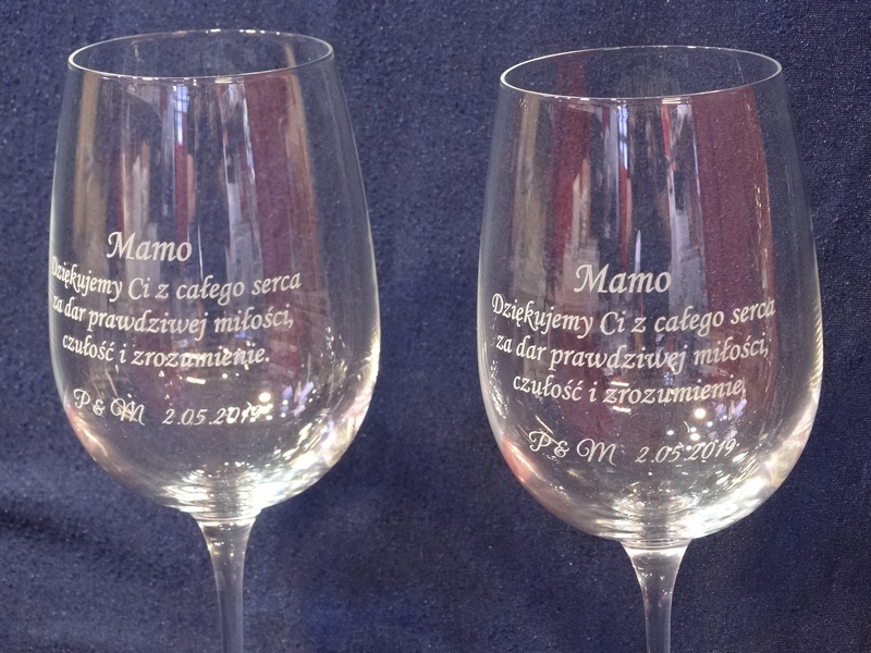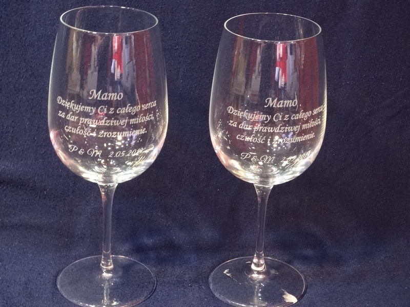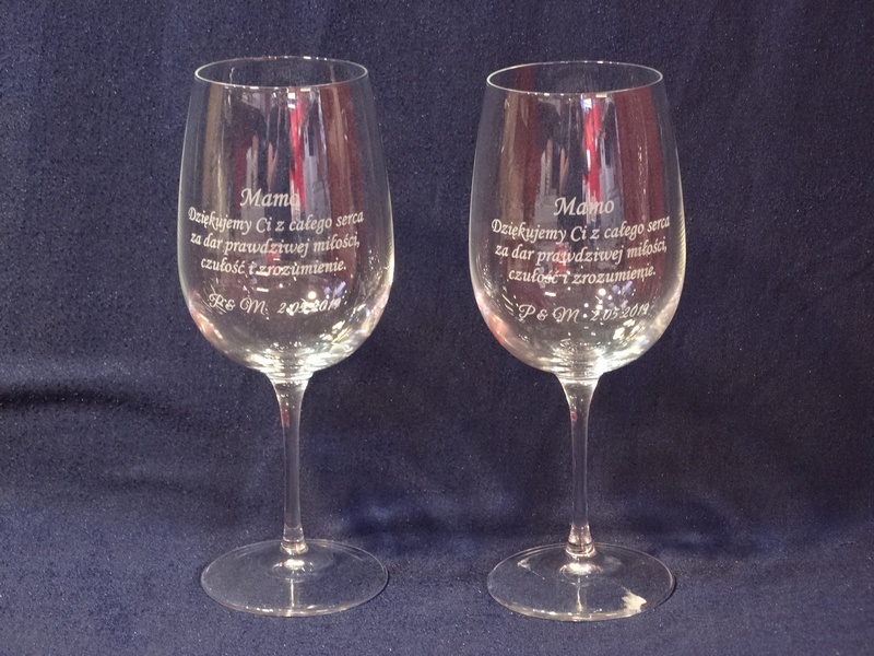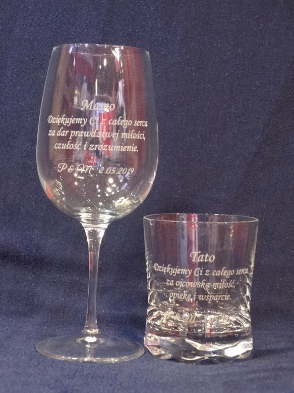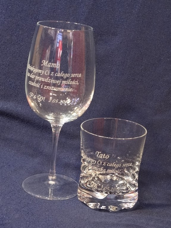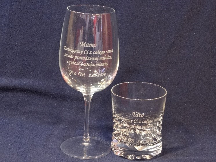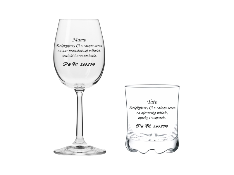 Podziękowanie dla Rodziców w postaci kompletu składającego się z kieliszka do wina dla mamy oraz szklaneczki do whisky dla taty.