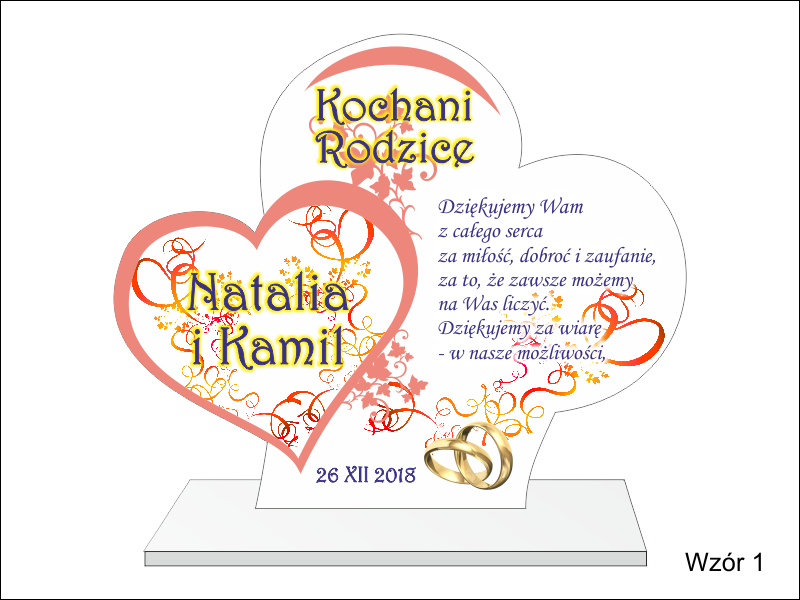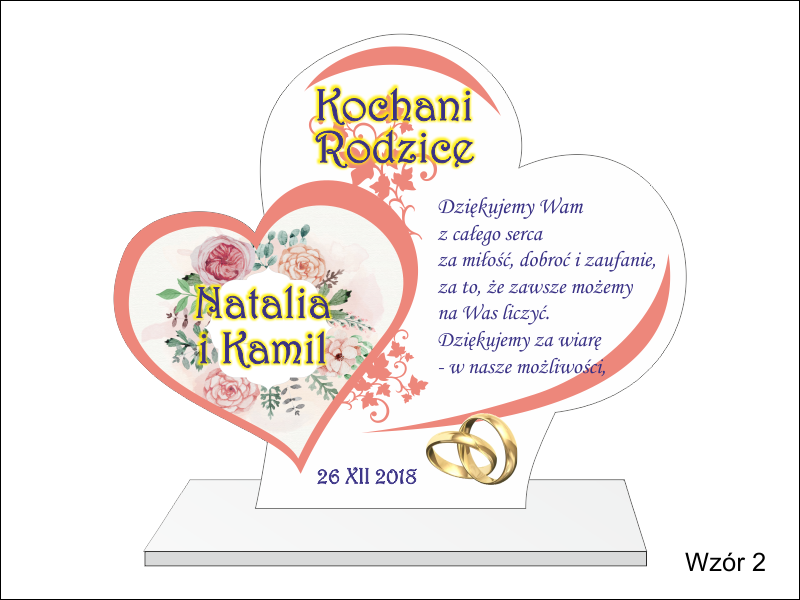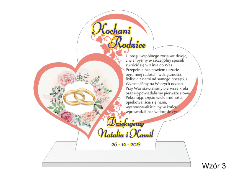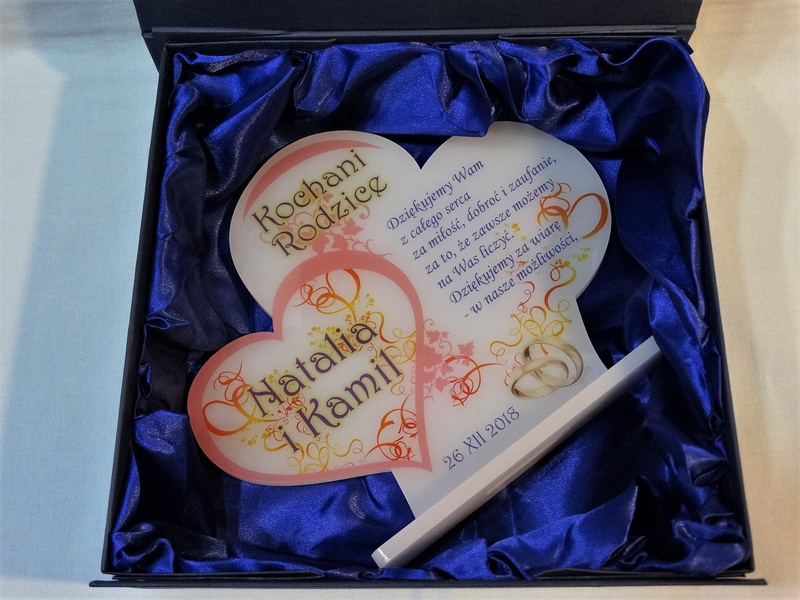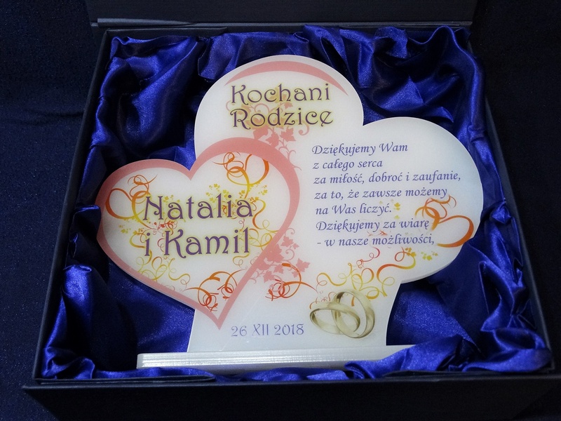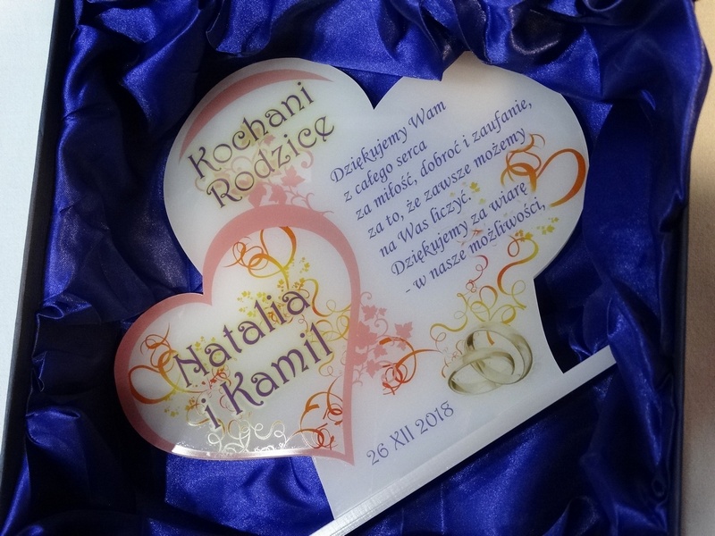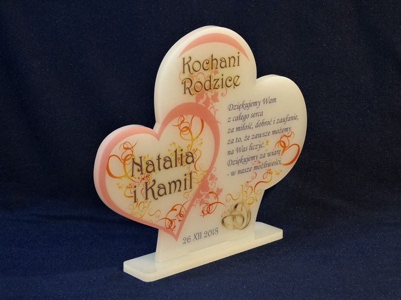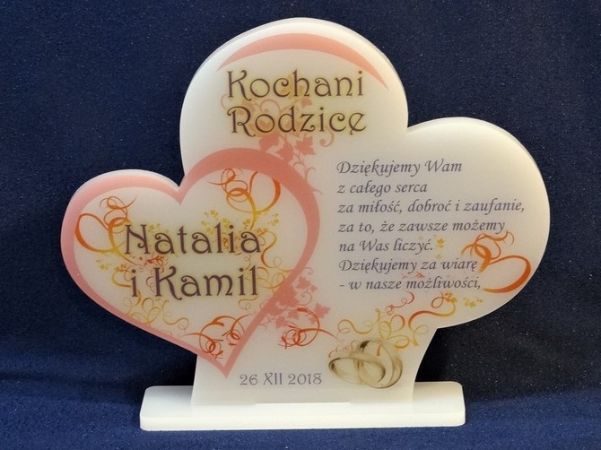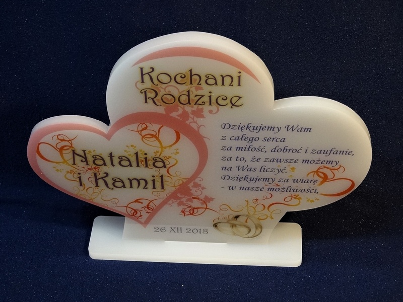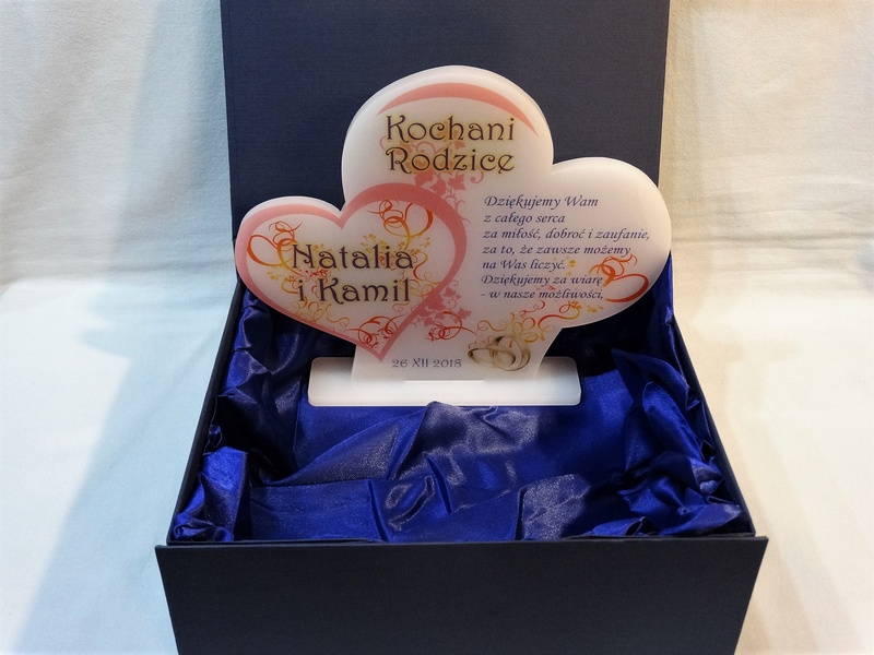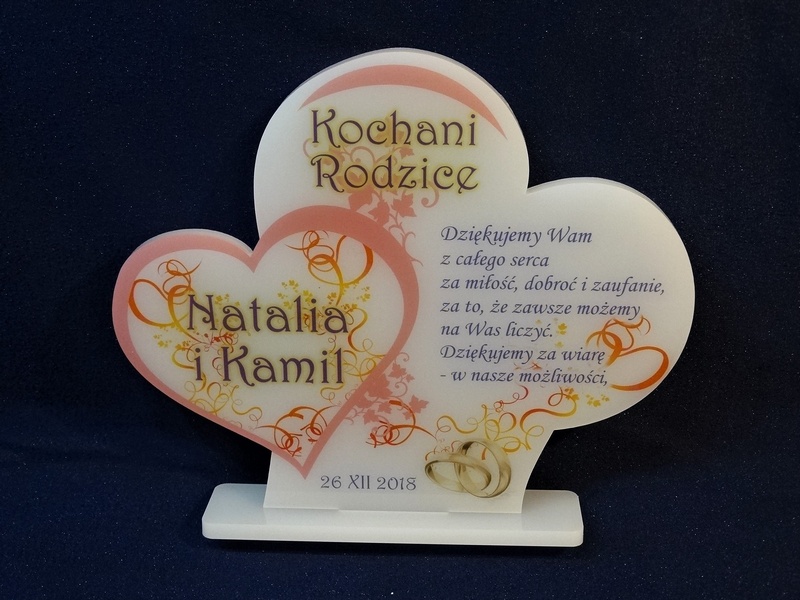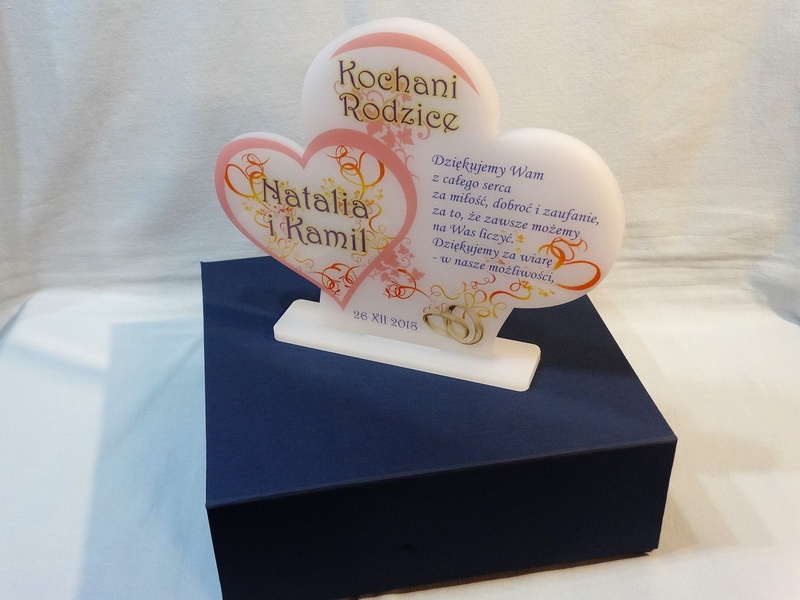 Statuetka z pleksi z nadrukiem dedykacji, ozdobnych grafik i zdjęć jako Podziękowanie dla Rodziców od Młodych w dniu ślubu.